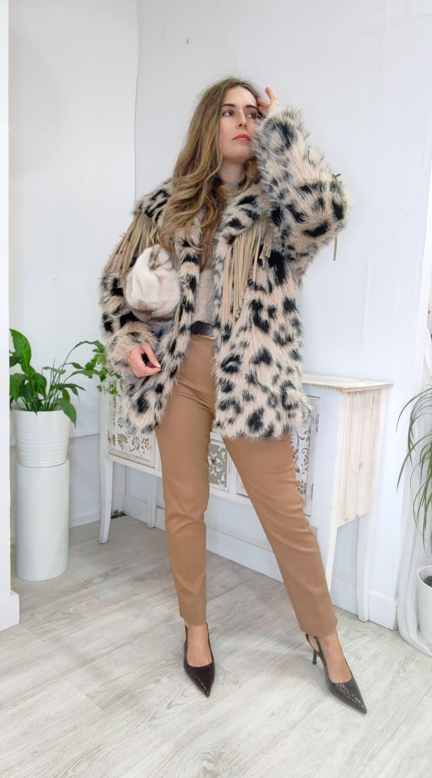 Este abrigo combina el efecto piel más suave con un diseño espectacular: mezcla de estampado animal, textura de pelo largo y detalles en flecos camel que le aportan un aire boho sofisticado.