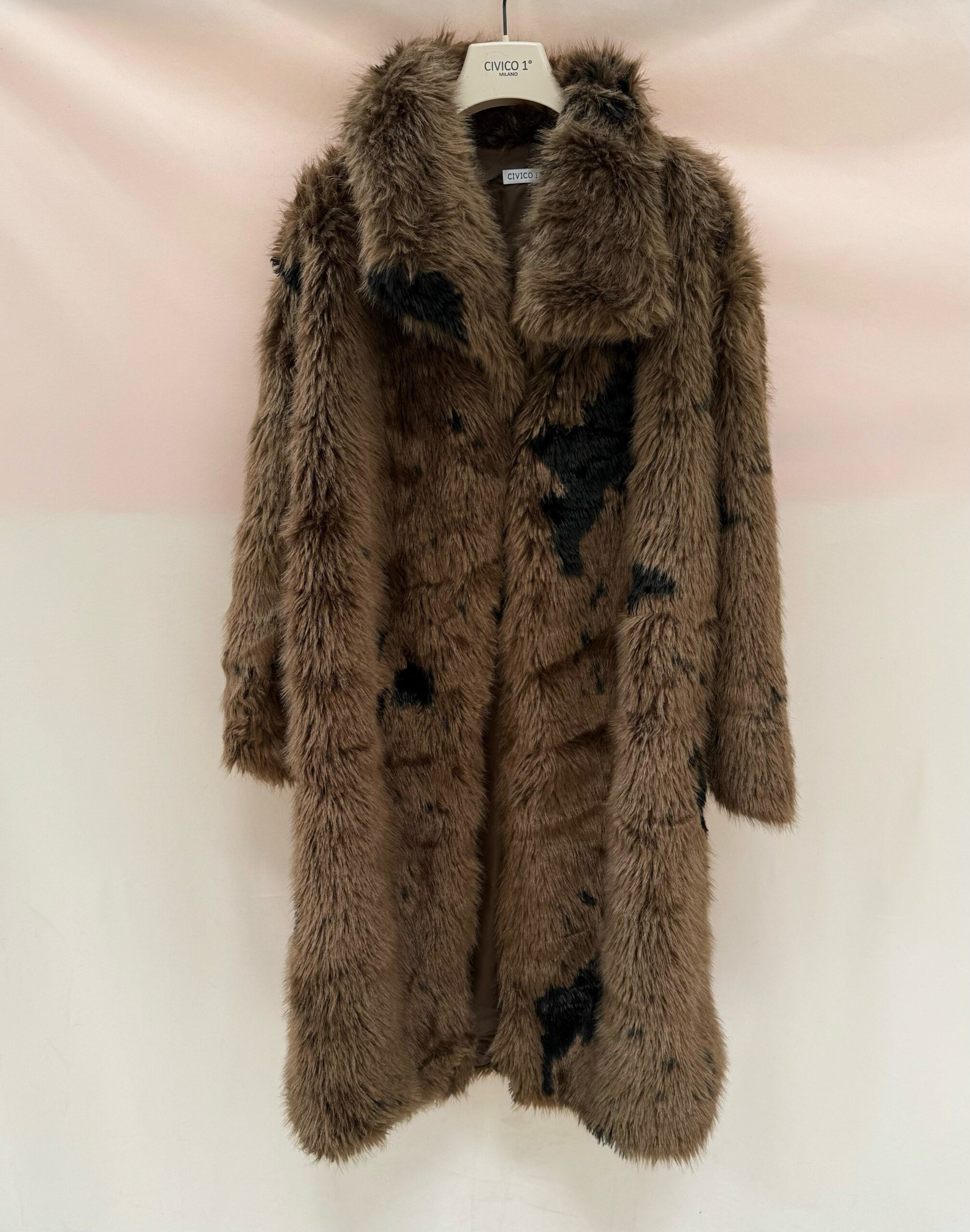 Abrigo de pelo en tonos marrones y manchas en negro, con cinturón y forrado.