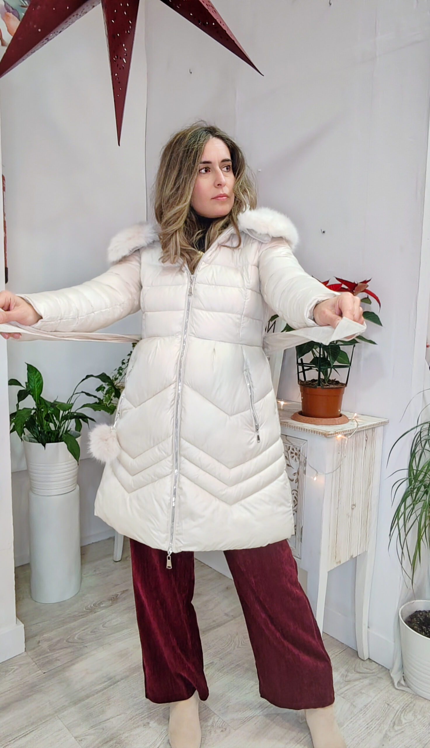 Abrigo enguatado en color marfil con cinturón y pom pom de adorno de quita y pon, lleva gorro y cuello de pelo que se quita.