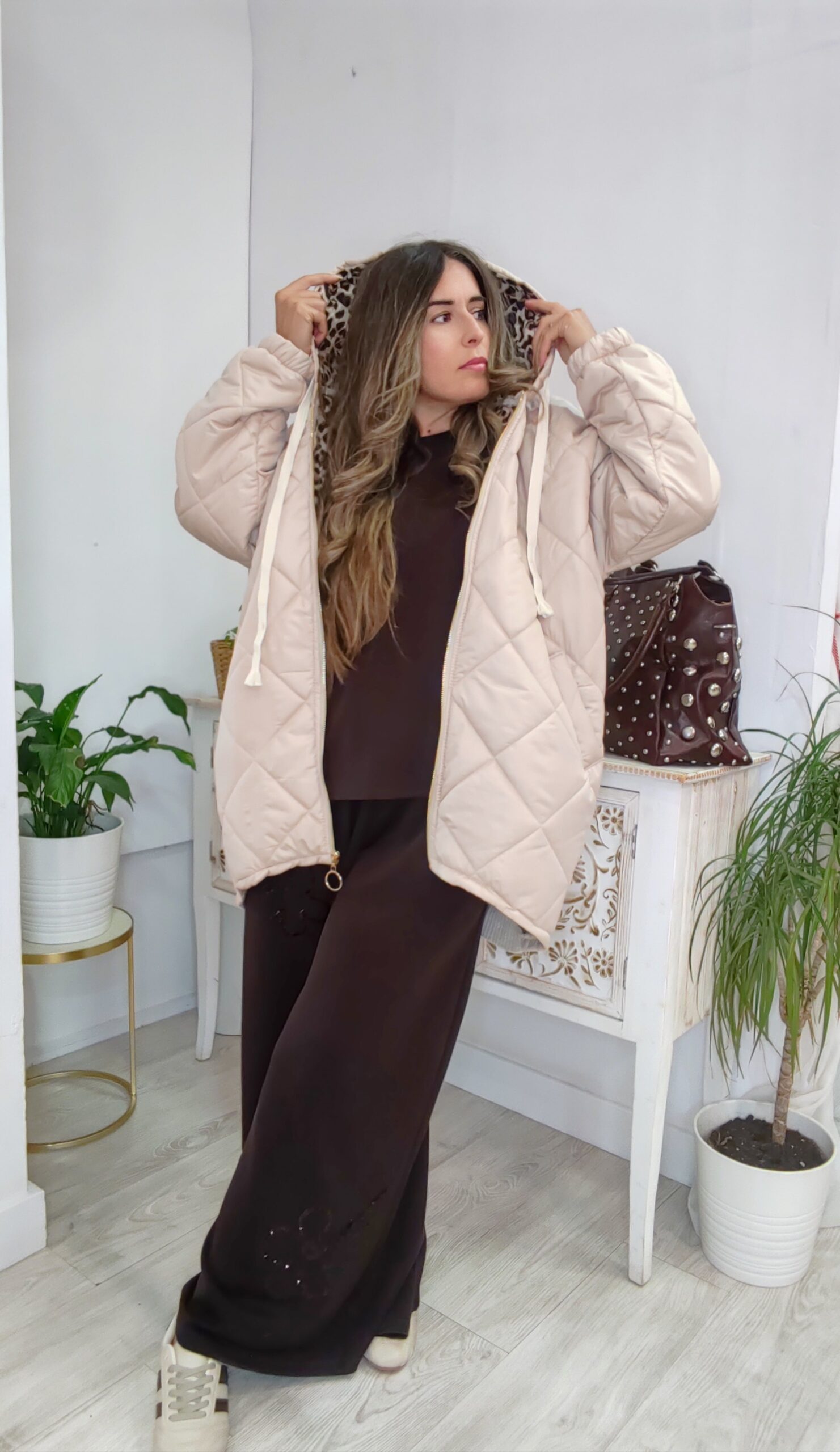 Chaquetón en beige con elástico en la parte de abajo con cremallera, forro en animal print y con gorro