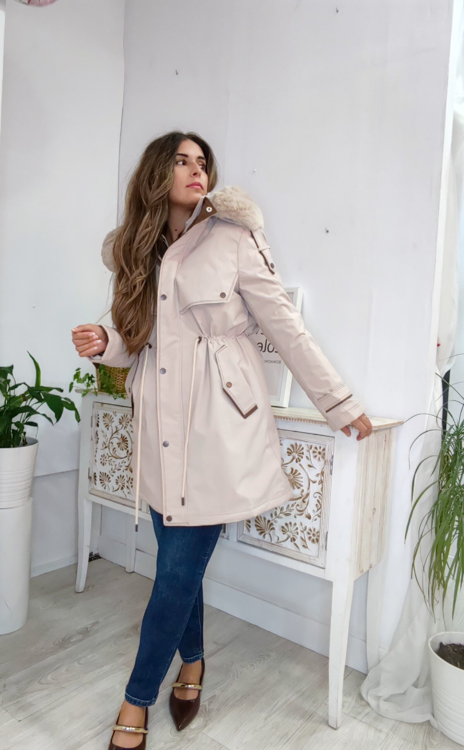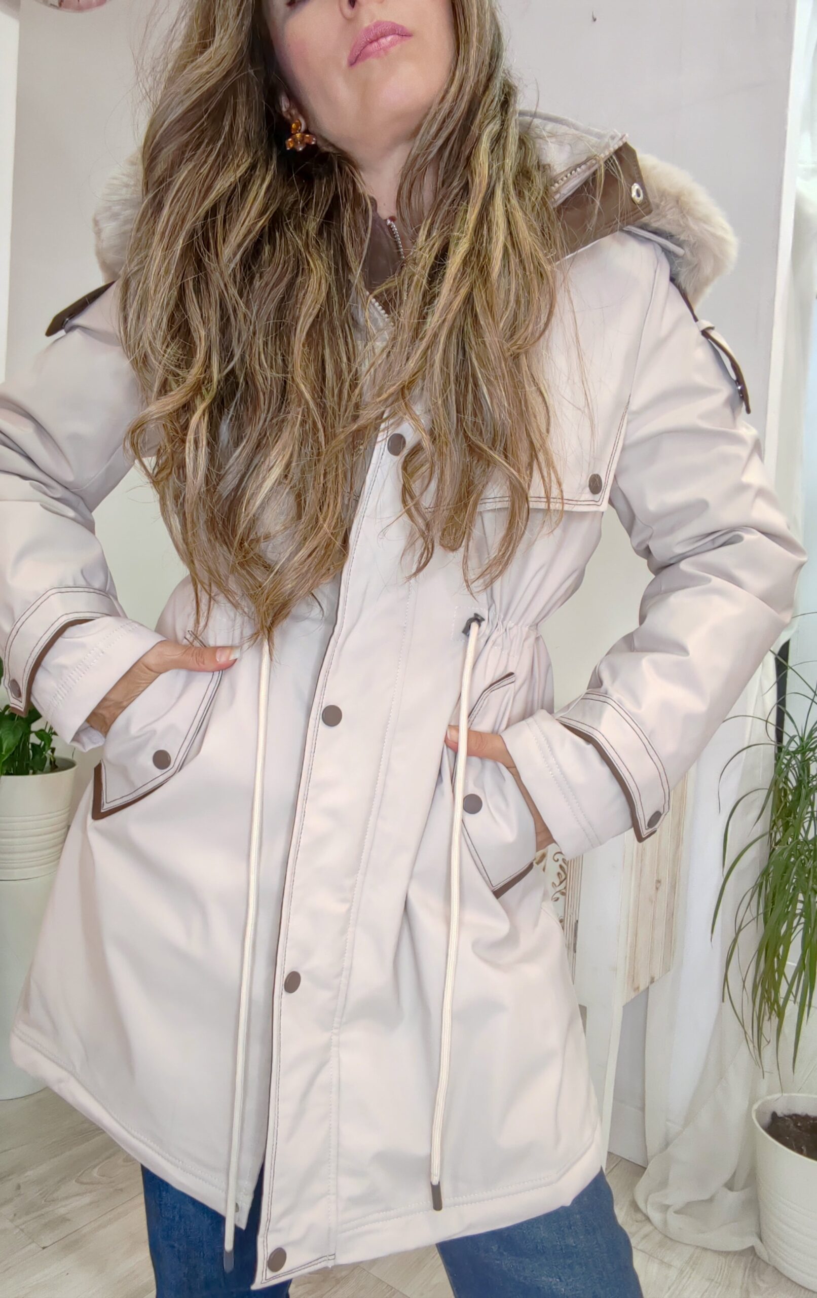 Abrigo tipo gabardina de tejido impermeable en color beige con detalles en chocolate, gorro y pelo de quita y pon. Forrado por dentro de pelo.
