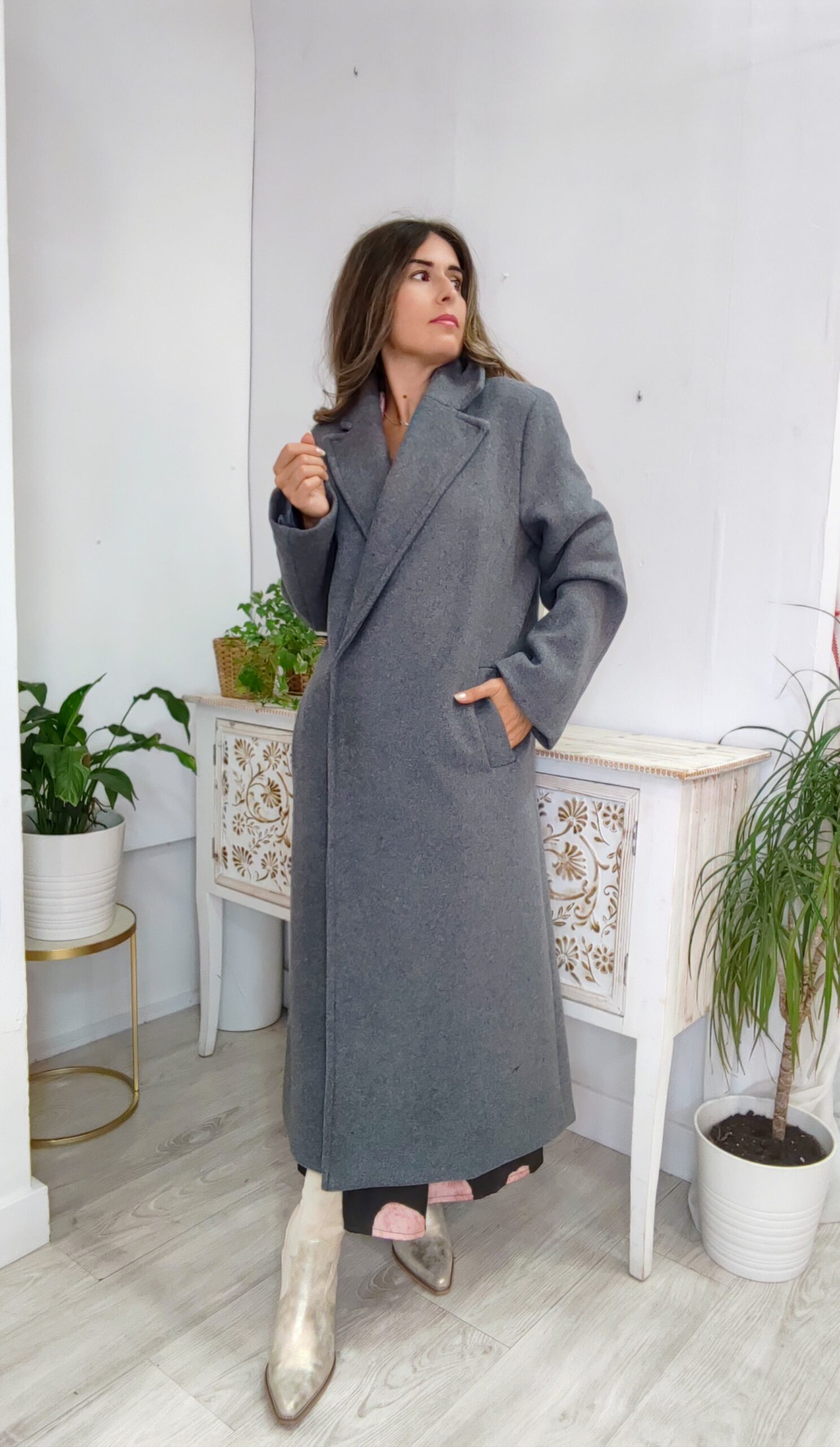 Abrigo de paño en gris, abrigo cruzado y forrado.