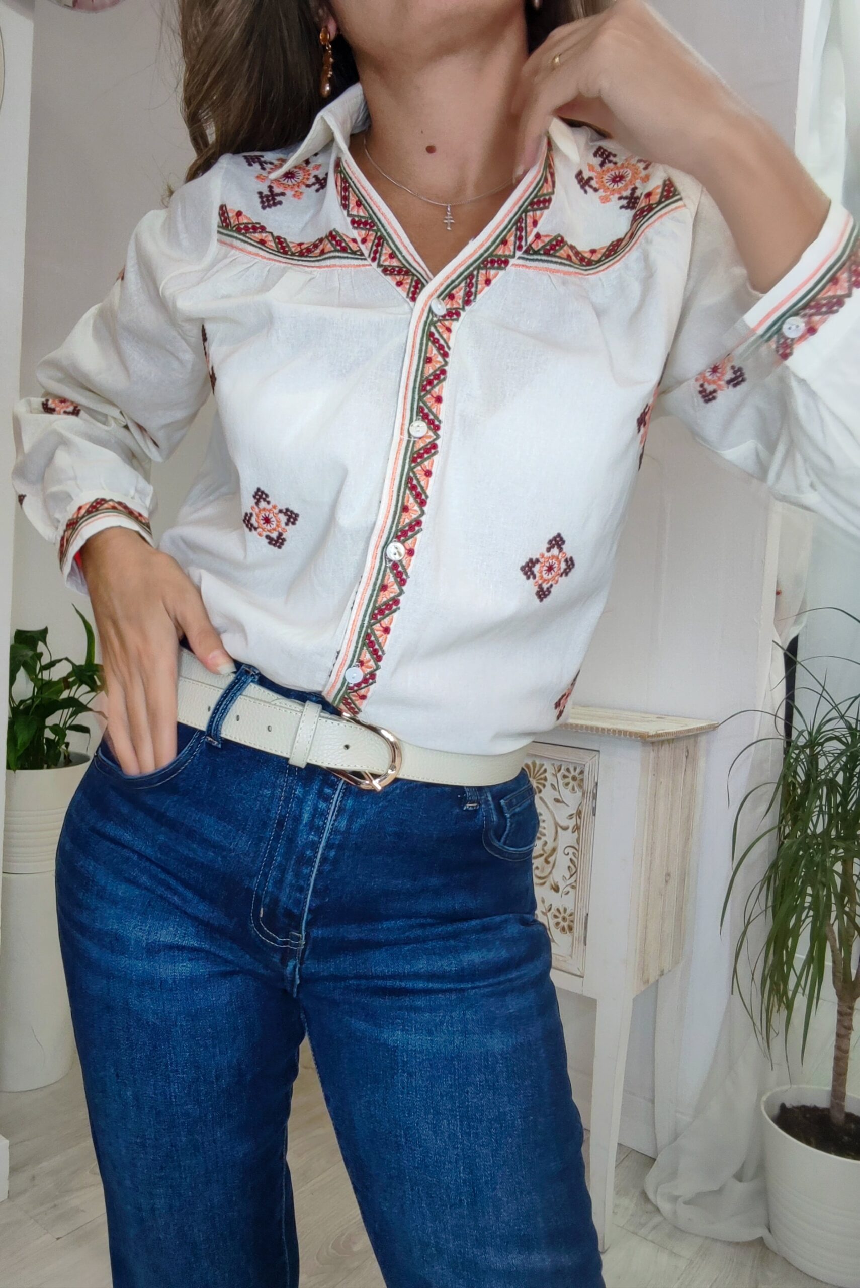 Blusa beige con bordado en color salmón, burdeos y verde.
