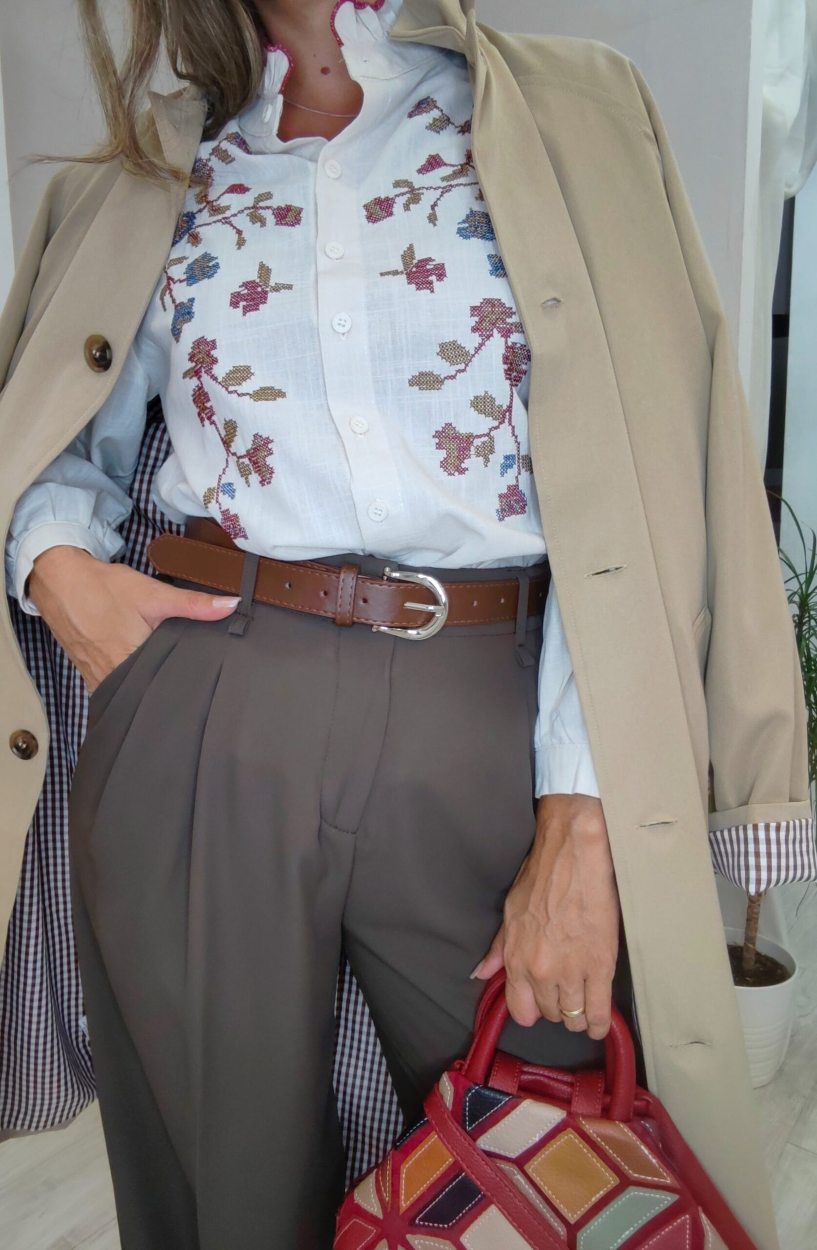 Blusa beige con bordado en punto de cruz con tonos burdeos y camel.