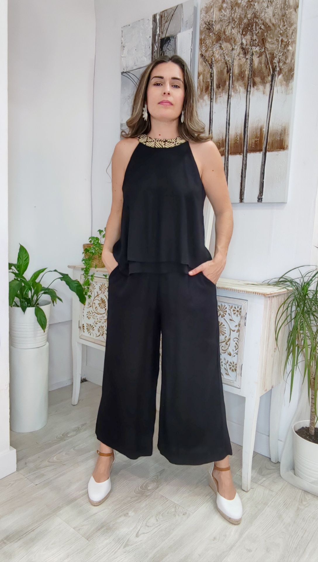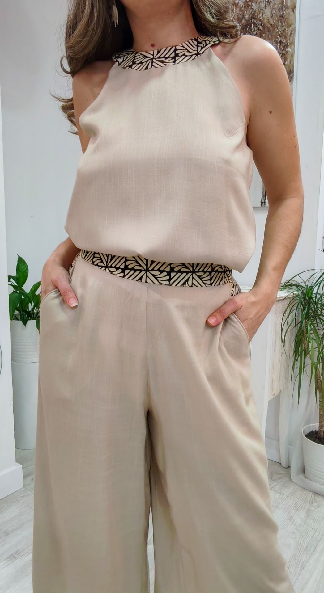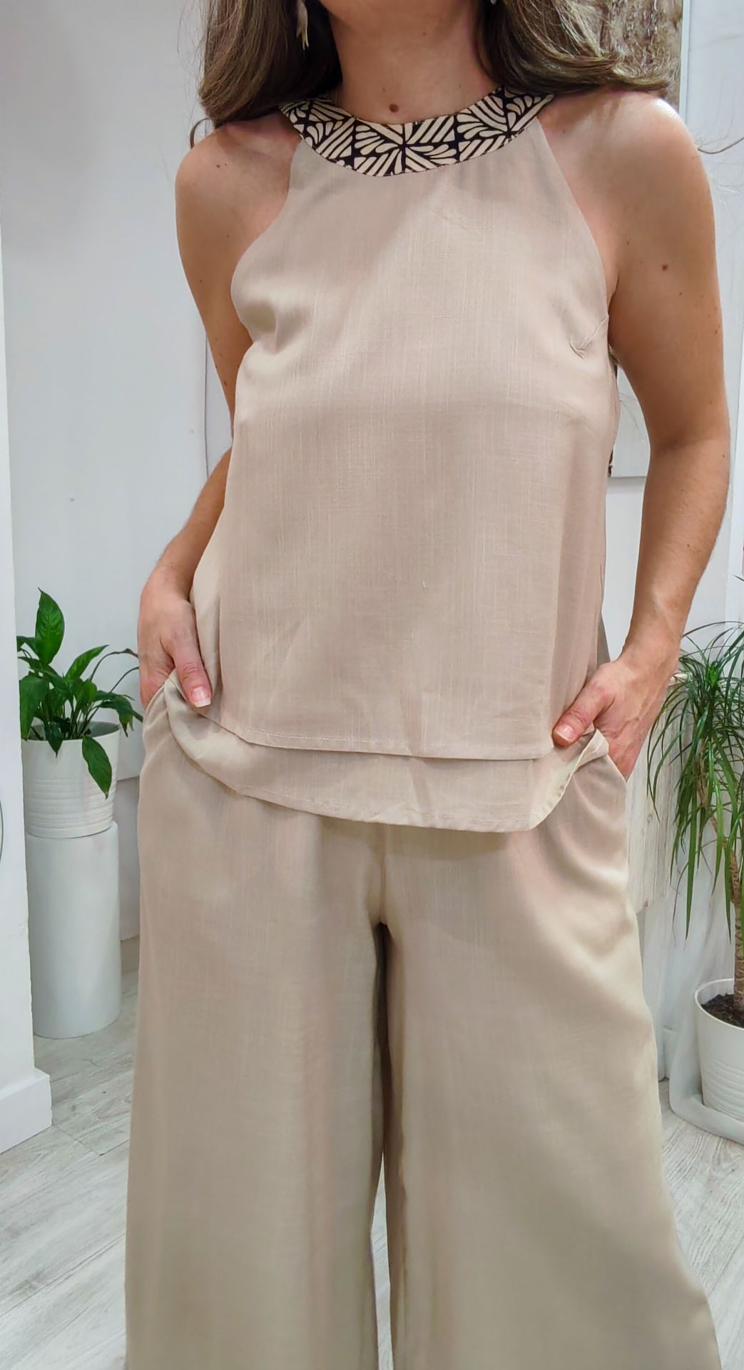 Top escote tipo «halter» con dos capas en tejido fluido de viscosa en beige natural, con estampado «Borde Geométrico» negro y marfil en cuello, abertura en espalda con botones de coco