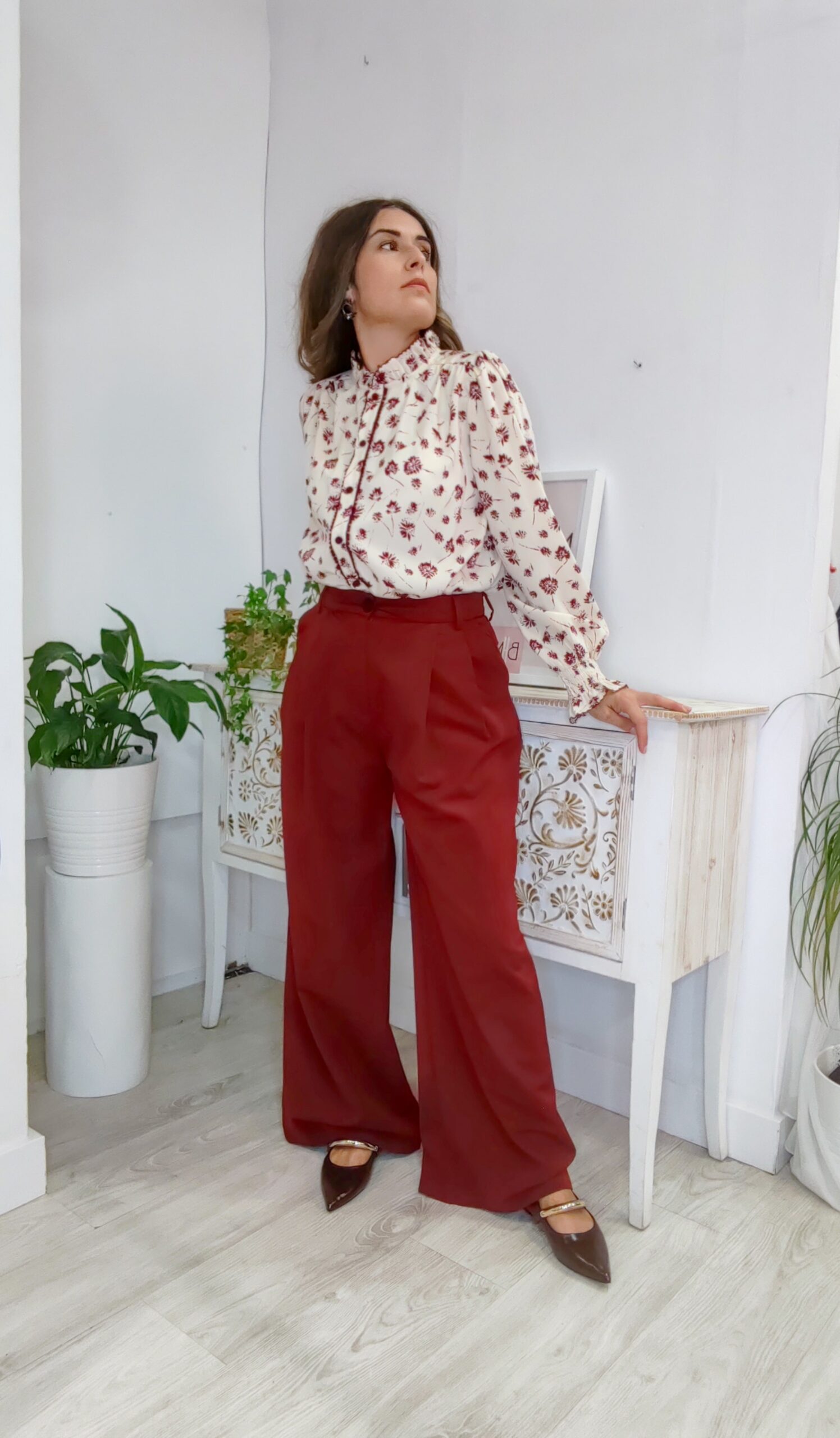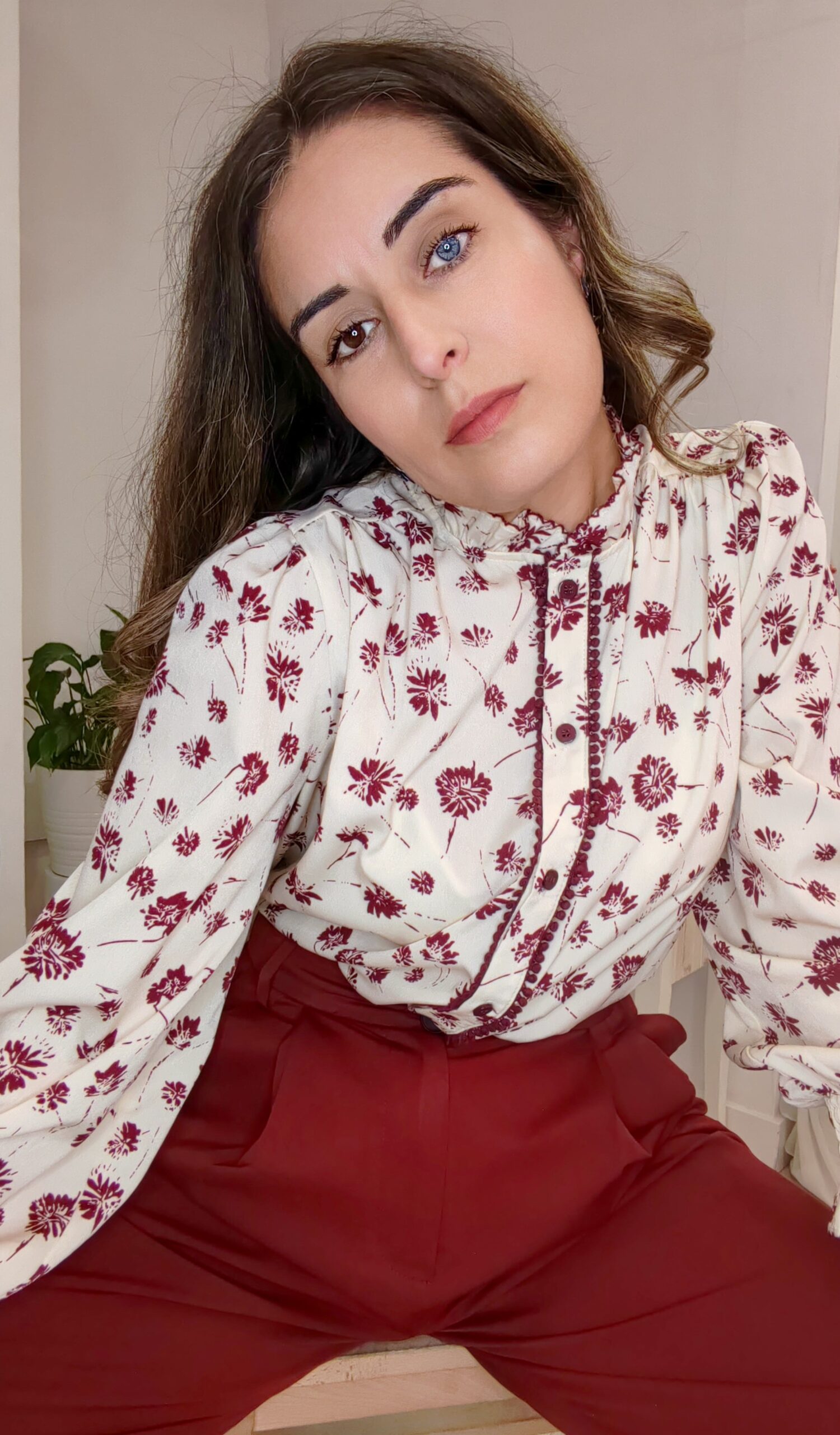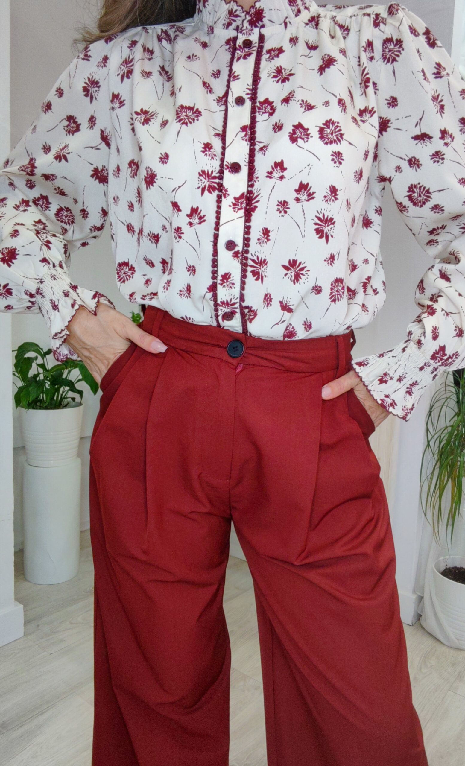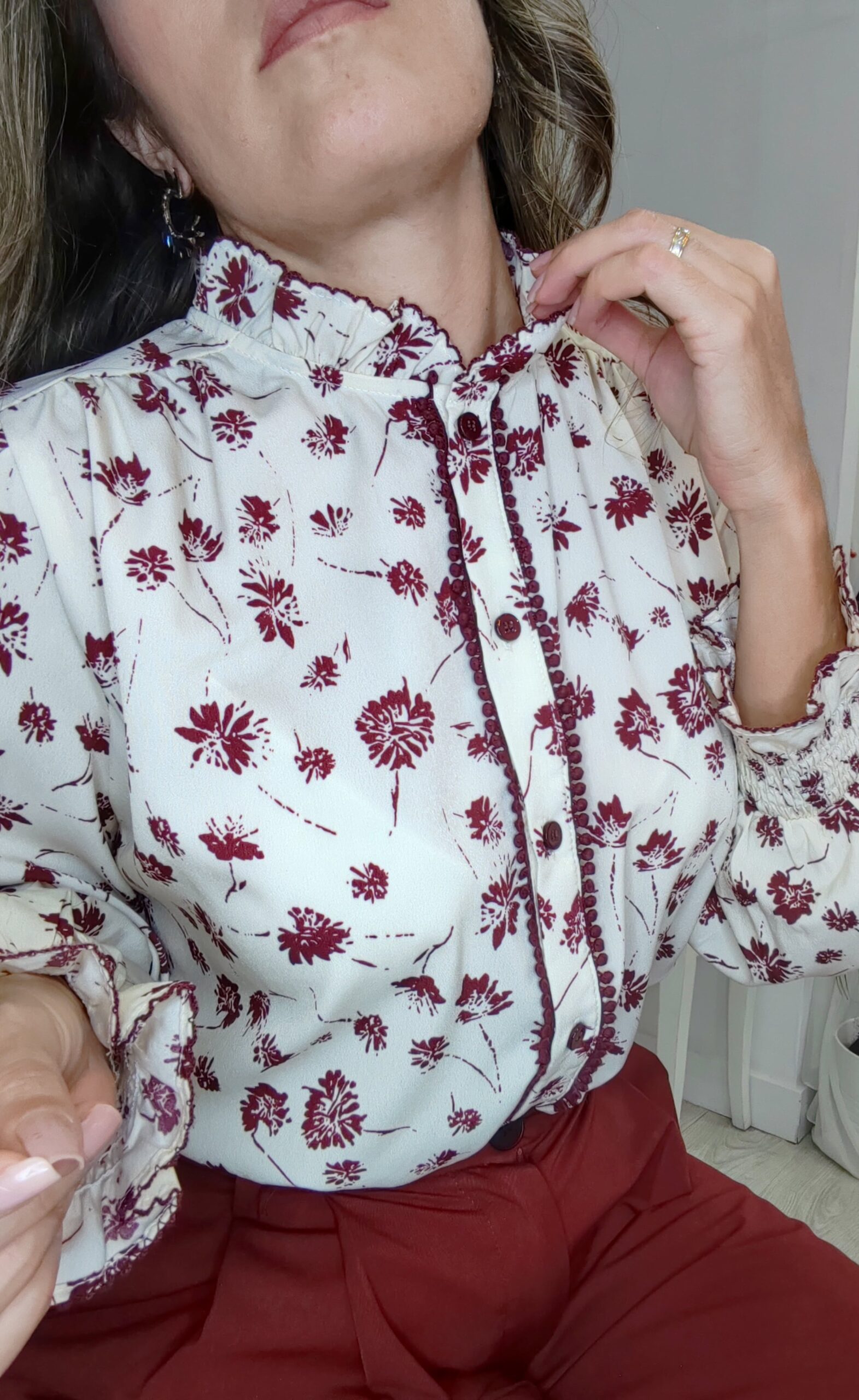Blusa de flores en burdeos fondo en beige con madroños pequeños de adorno.