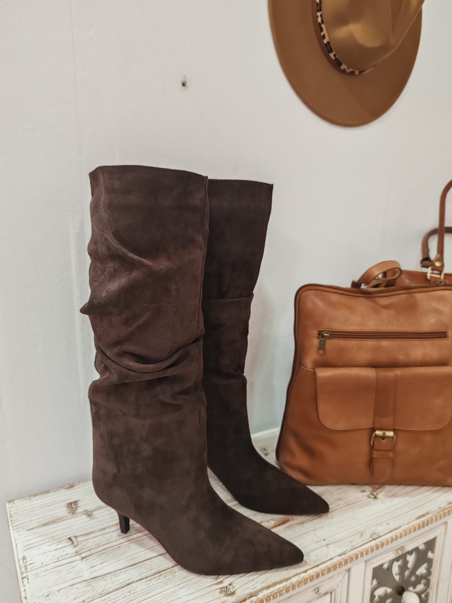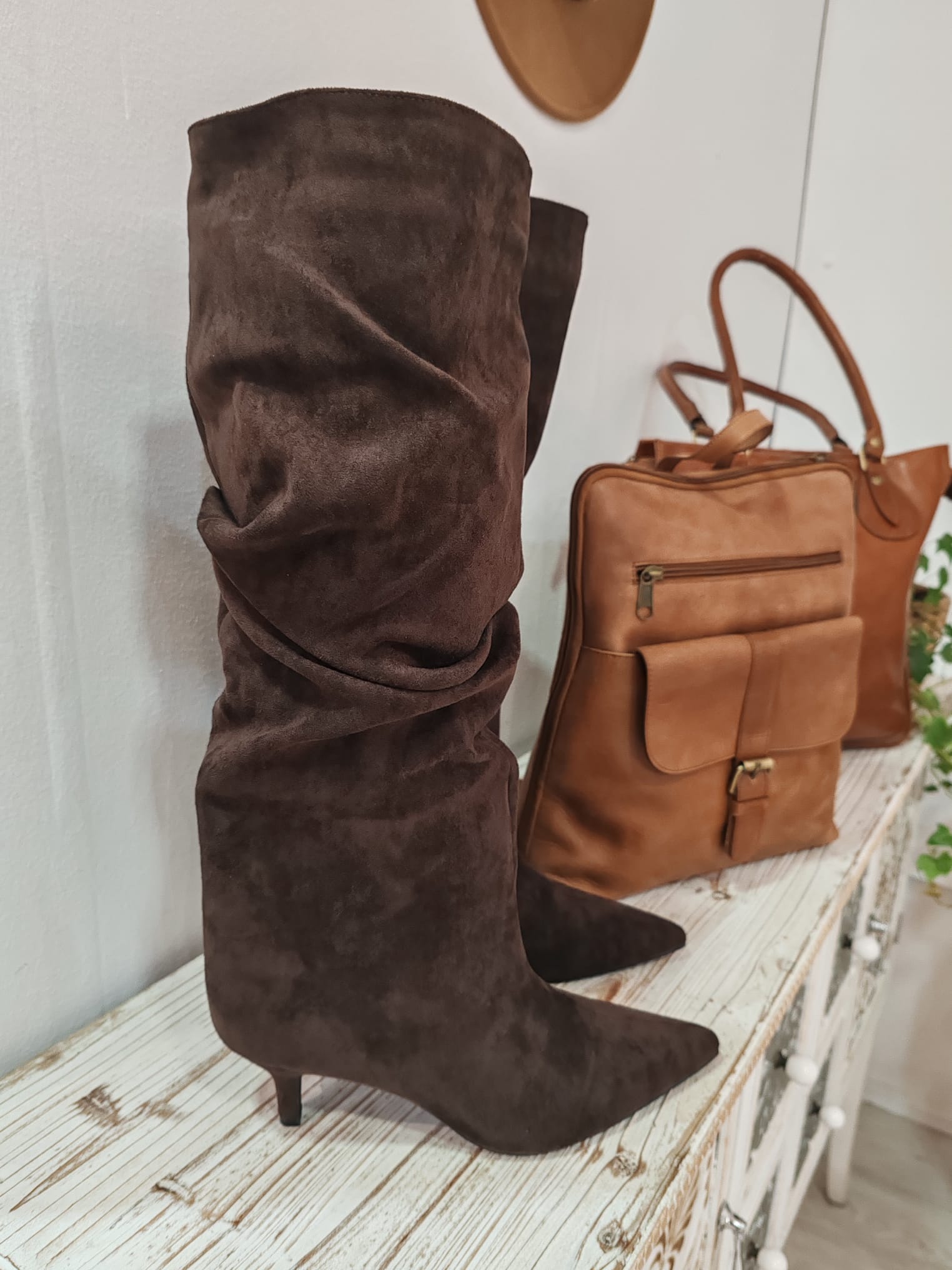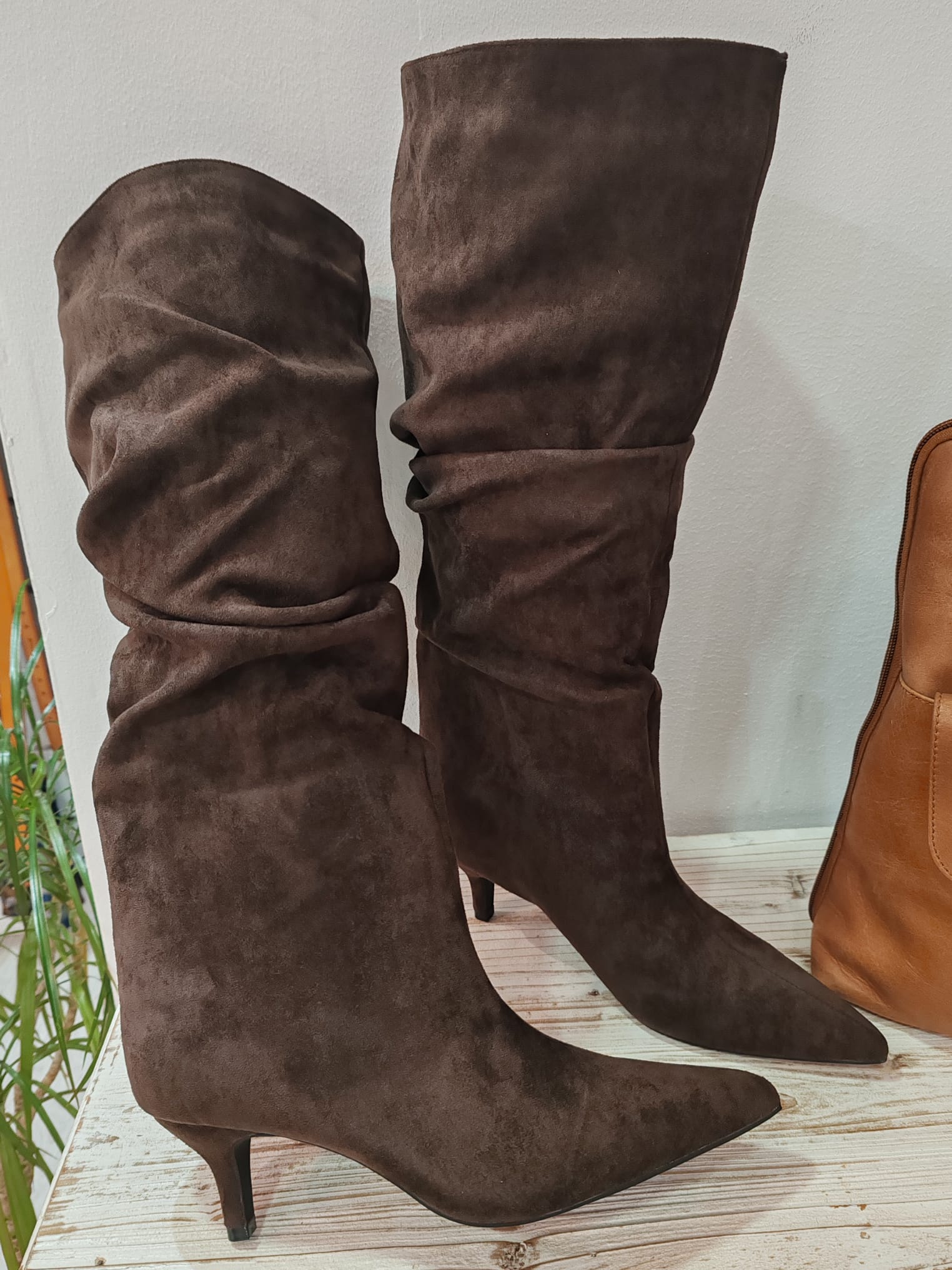 Bota alta de ante en color chocolate con tacón de 7 cm
