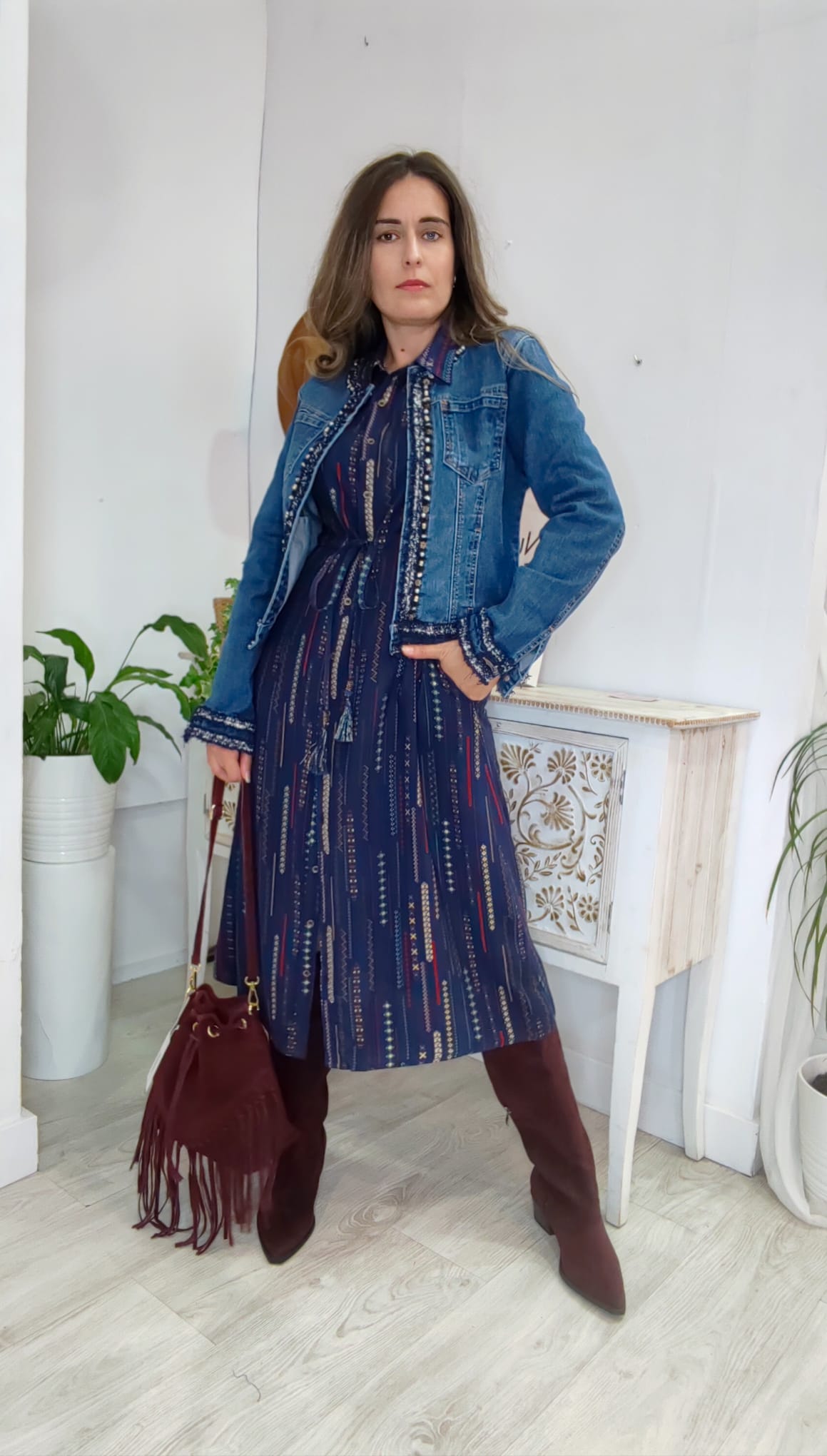 Cazadora vaquera. Detalle tweed con abalorios. Dos bolsillos de parche en el pecho. Cuello redondo. Manga larga. Cierre frontal con botones metálicos.