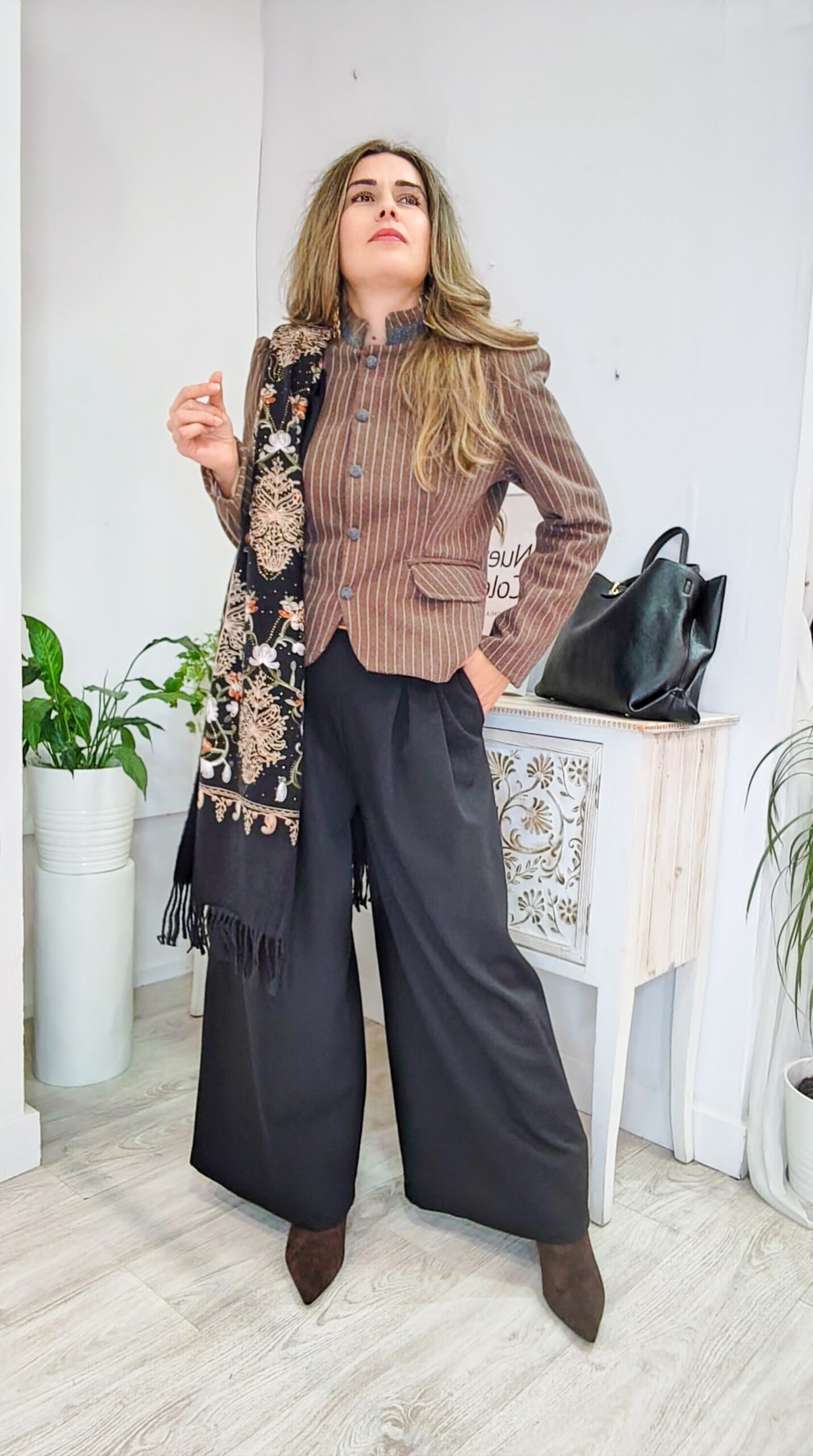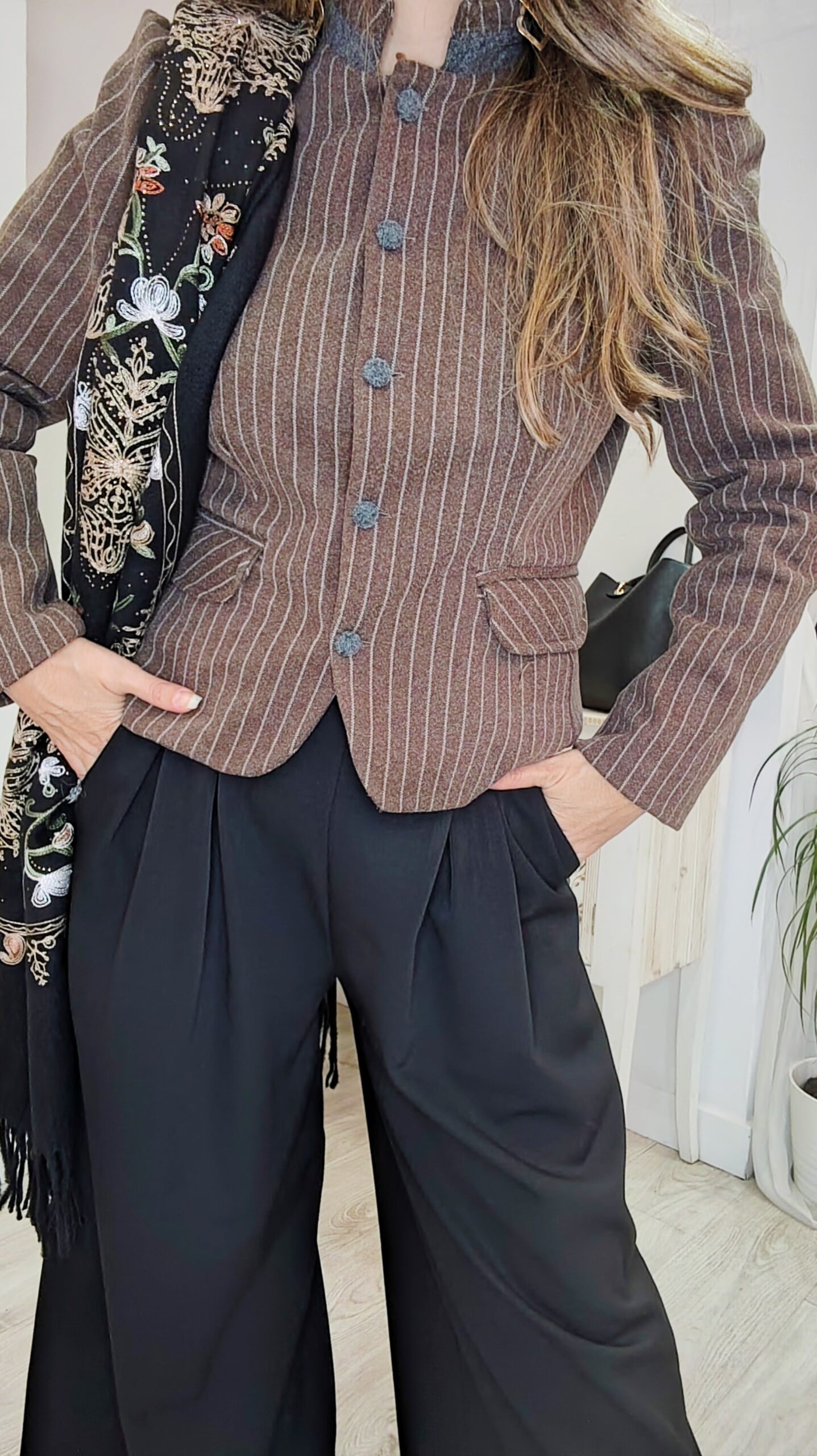 Chaqueta de paño con cuello tirilla, totalmente forrada y confeccionada con un ligero elástico que la aporta suavidad y comodidad.