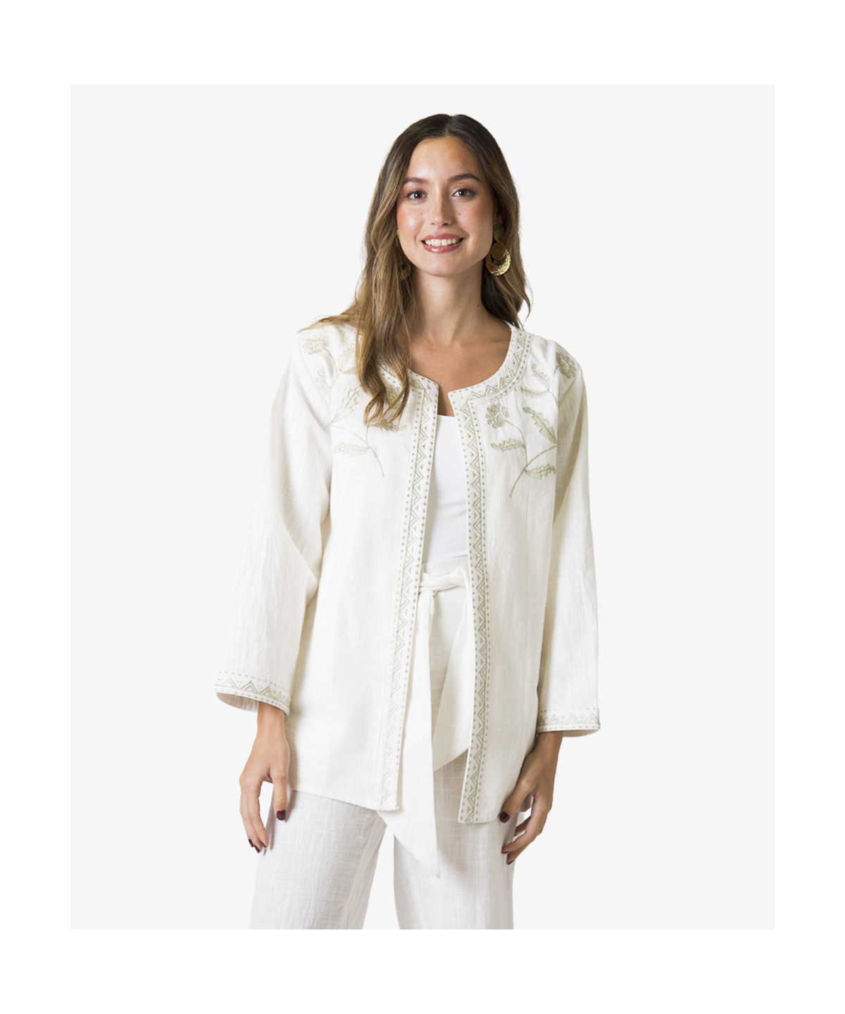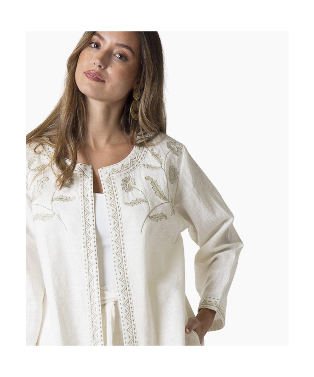 Chaqueta en tejido de algodón natural » cotton slub» con textura, con bordados en hilo plata envejecido: de ramas florales en pecho, y borde decorativo geométrico en escote, delanteros y puños. Con bolsillos y forro.
