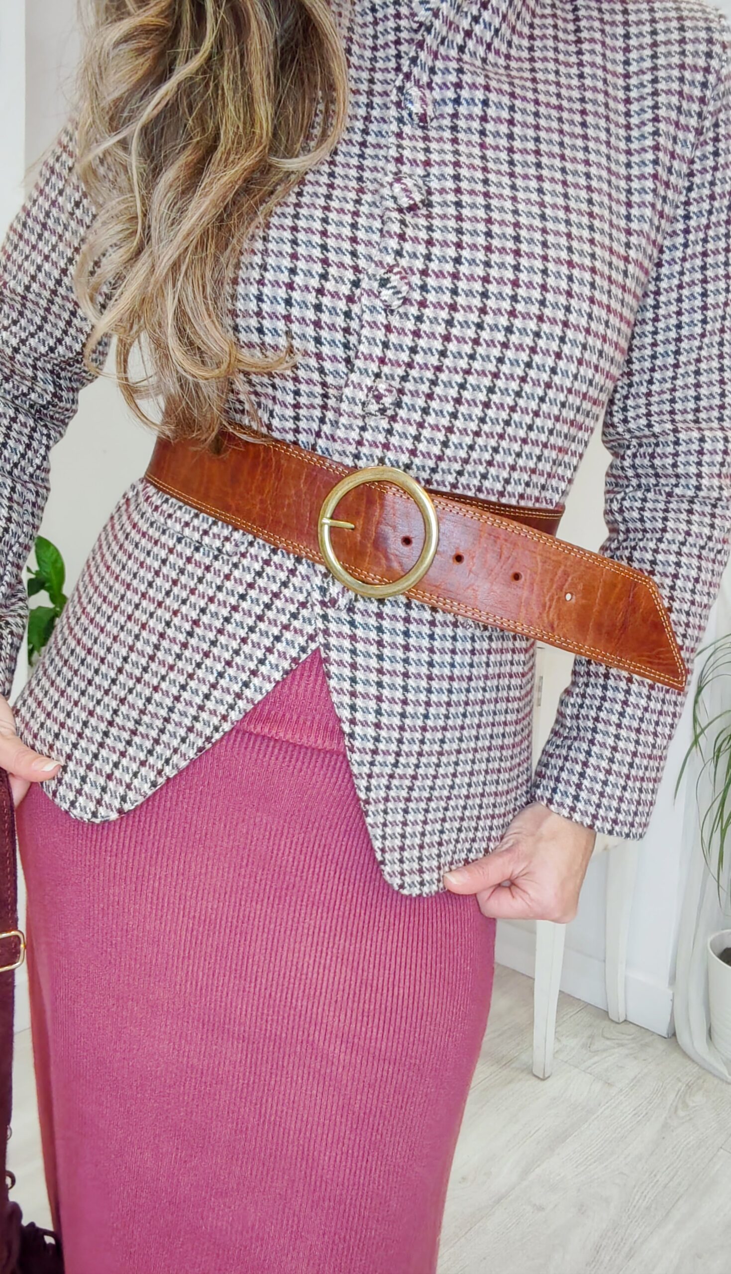 Cinturón de piel ancho en color marron con hebilla redonda.