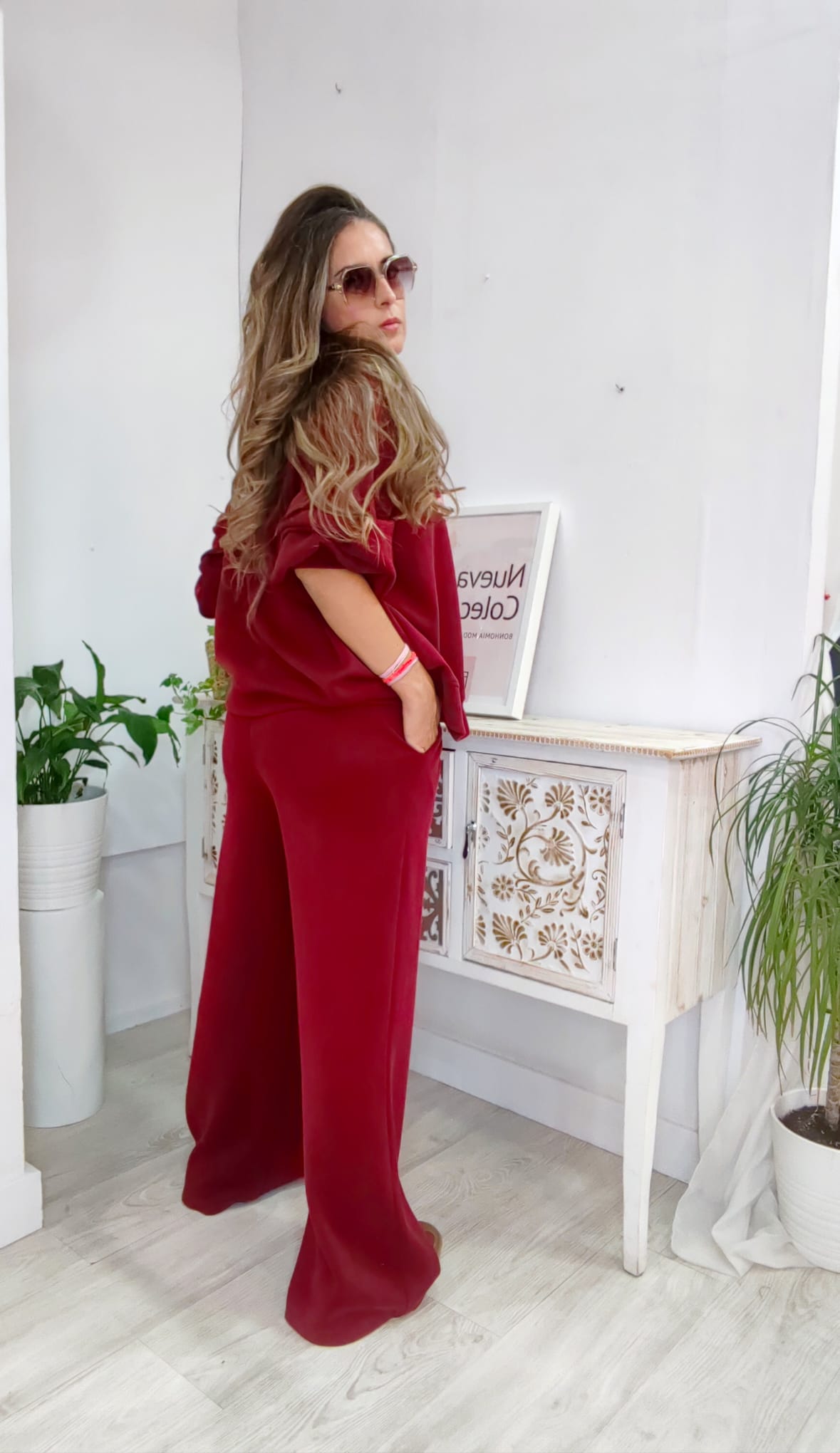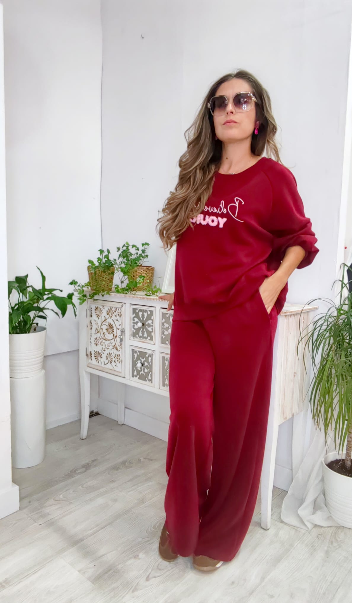 Conjunto de talla única, pantalon y sudadera con adorno de letras en color rosa.