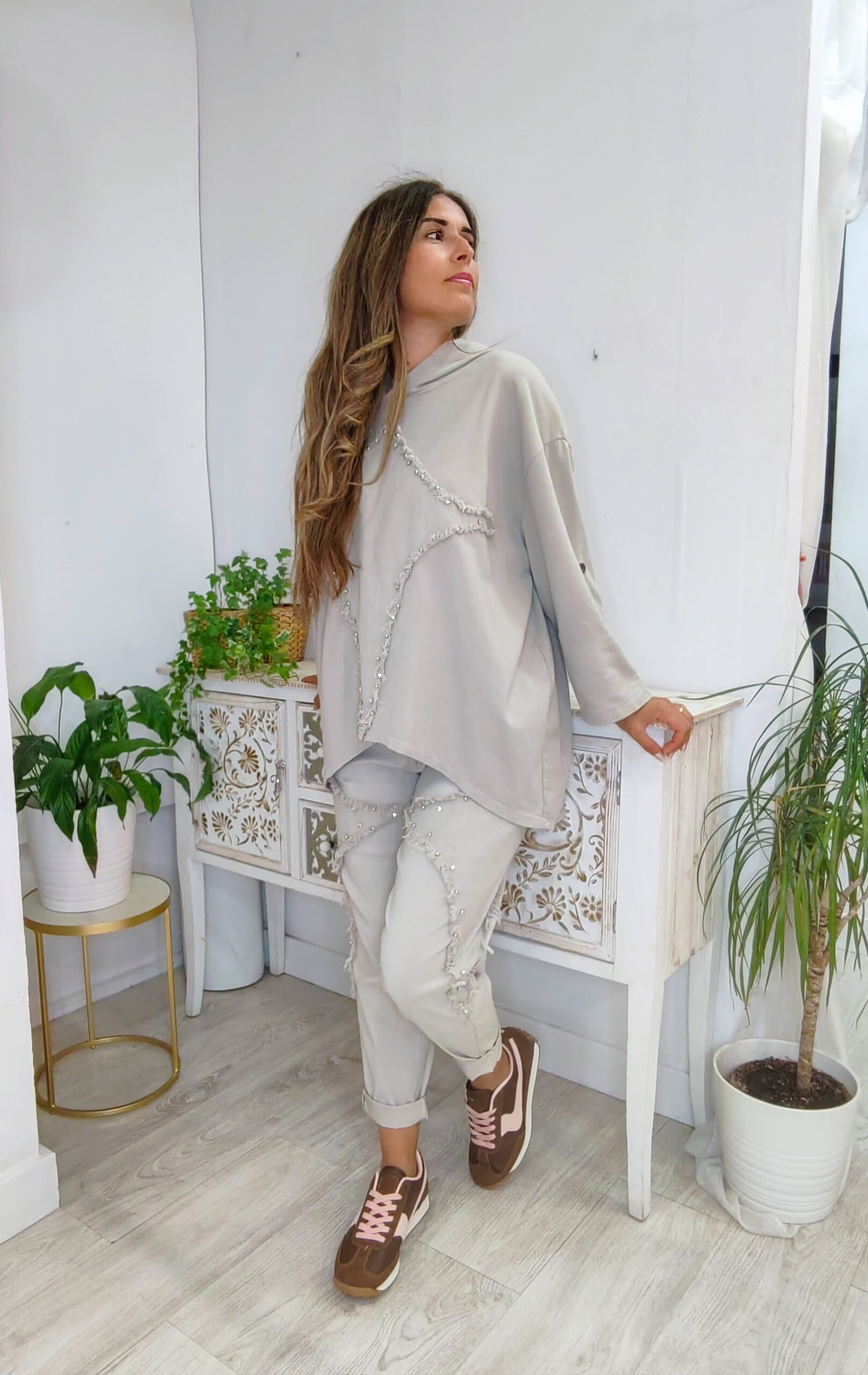 Conjunto de talla única, pantalon y sudadera con adorno en cristal.