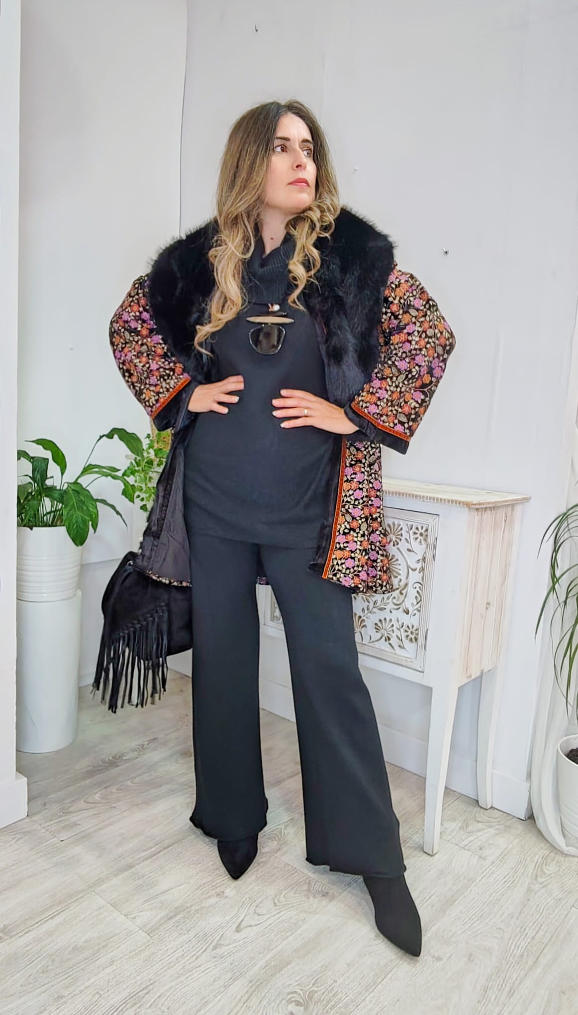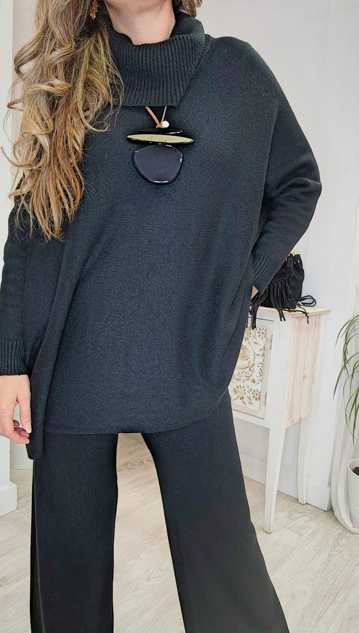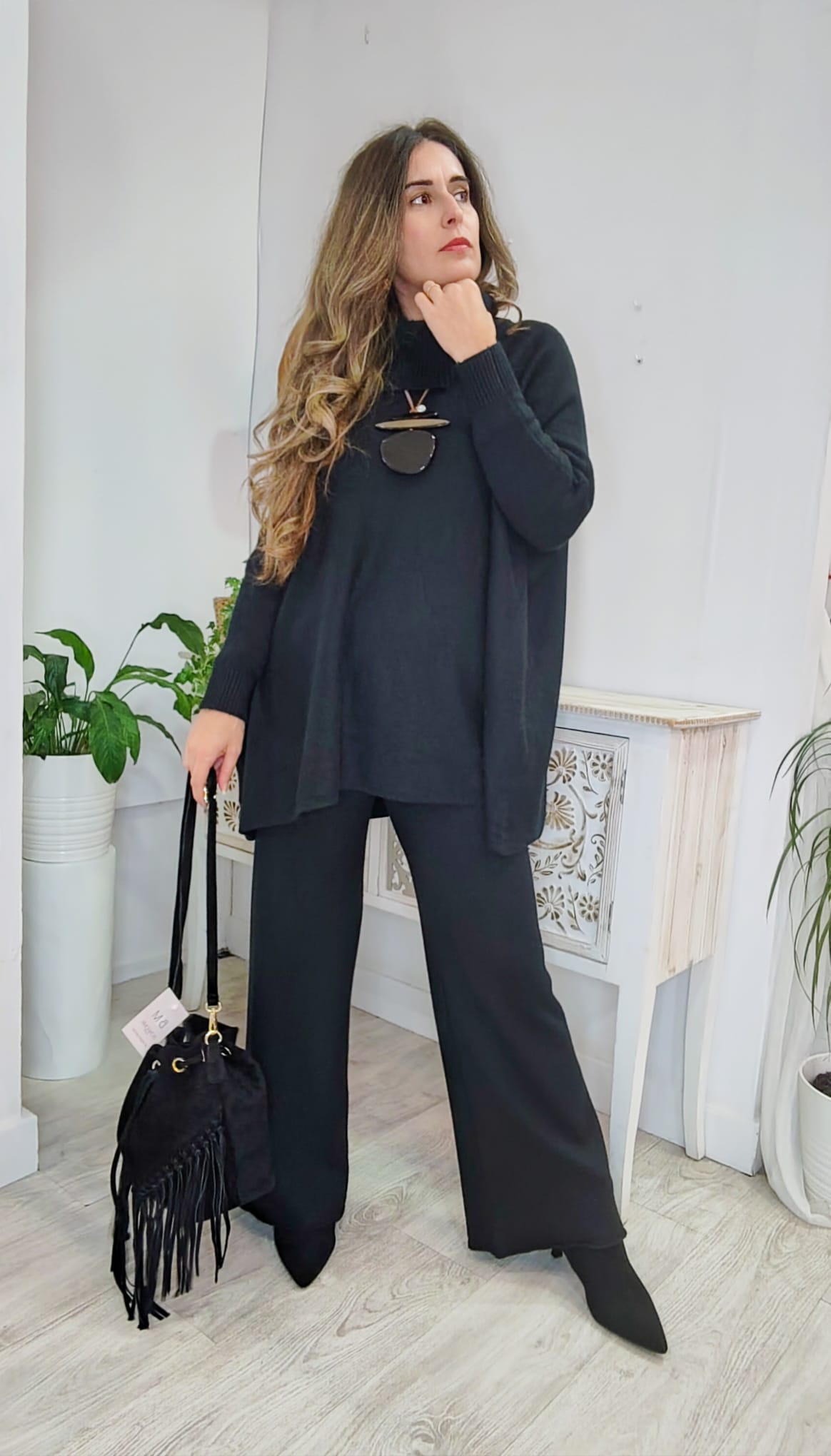 Conjunto de talla única, pantalon y jersey con mangas murciélago y cuello alto.