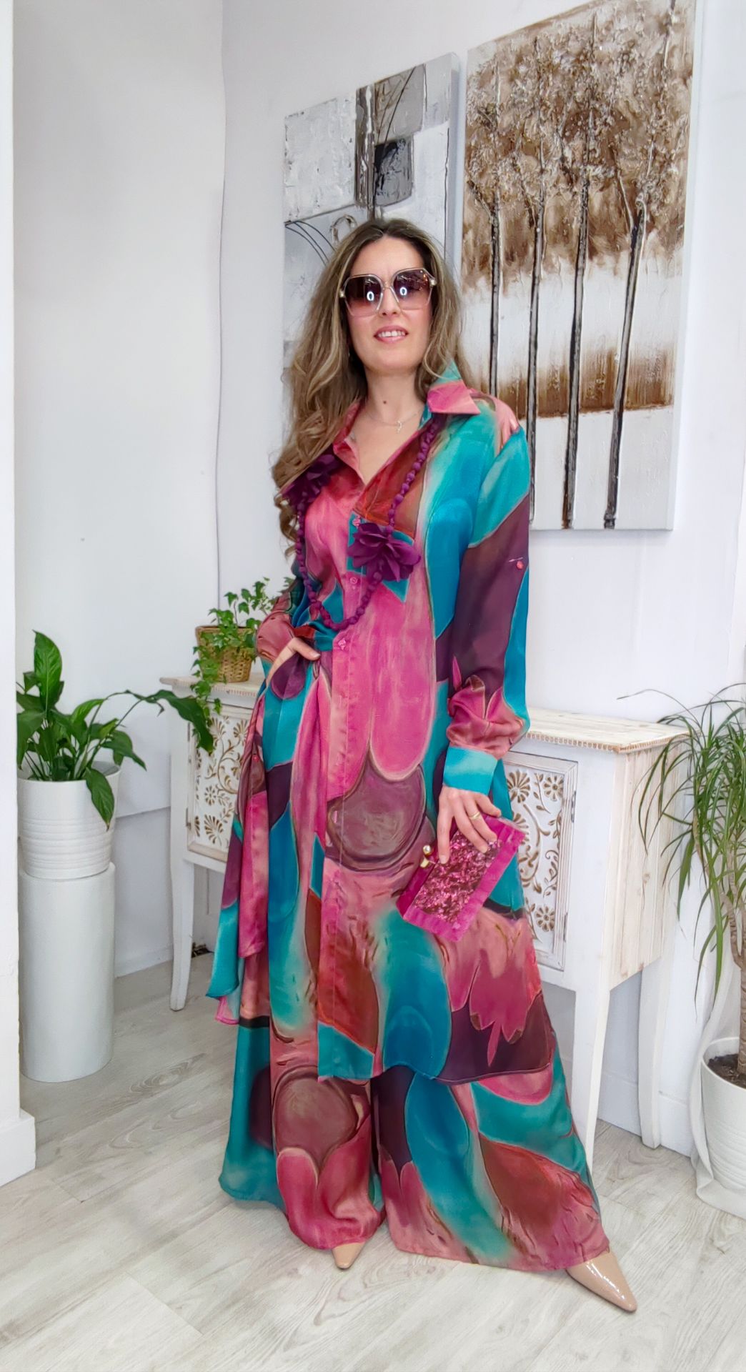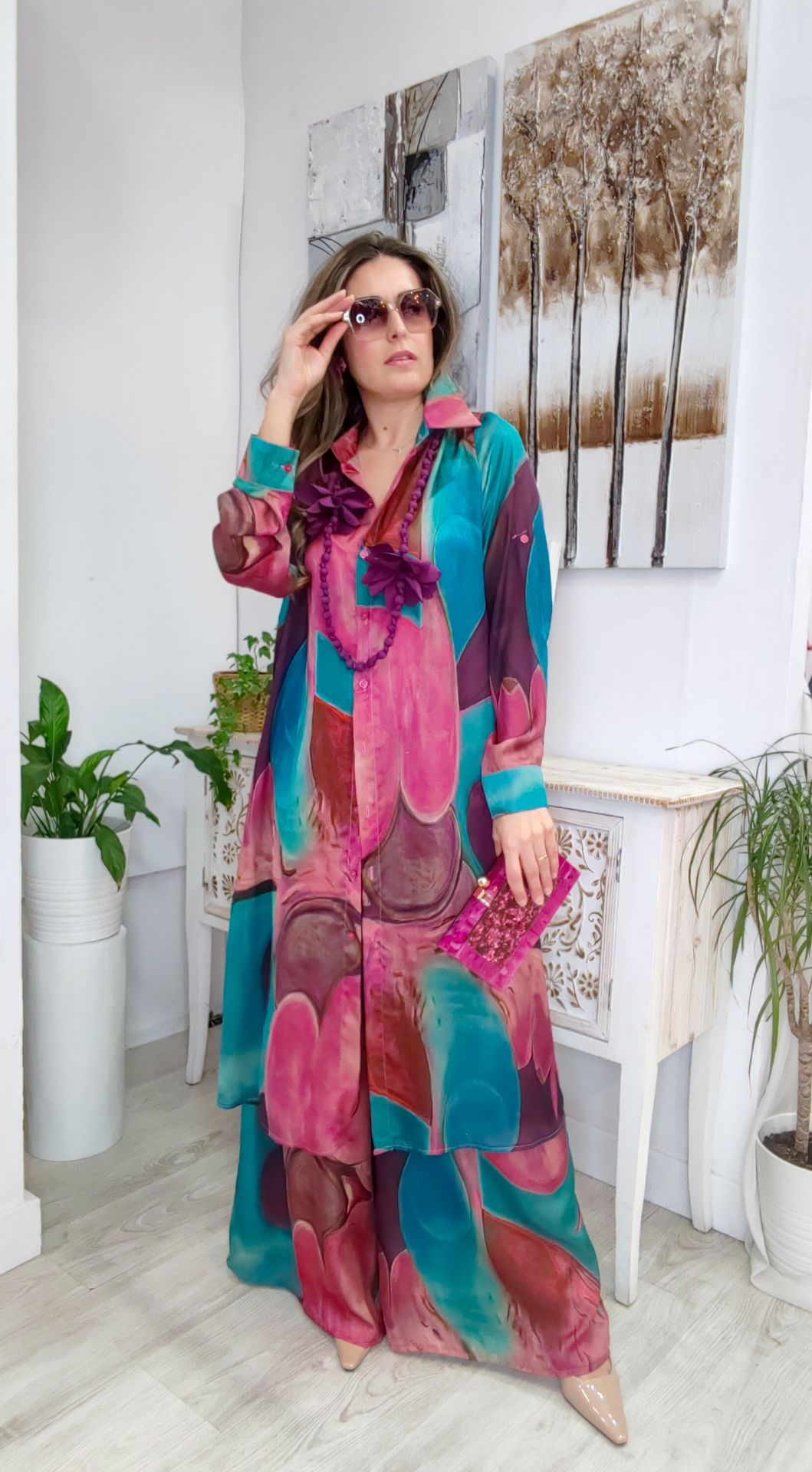 Conjunto de dos piezas pantalon con goma y bolsillos, camisola larga con apertura en los laterales.