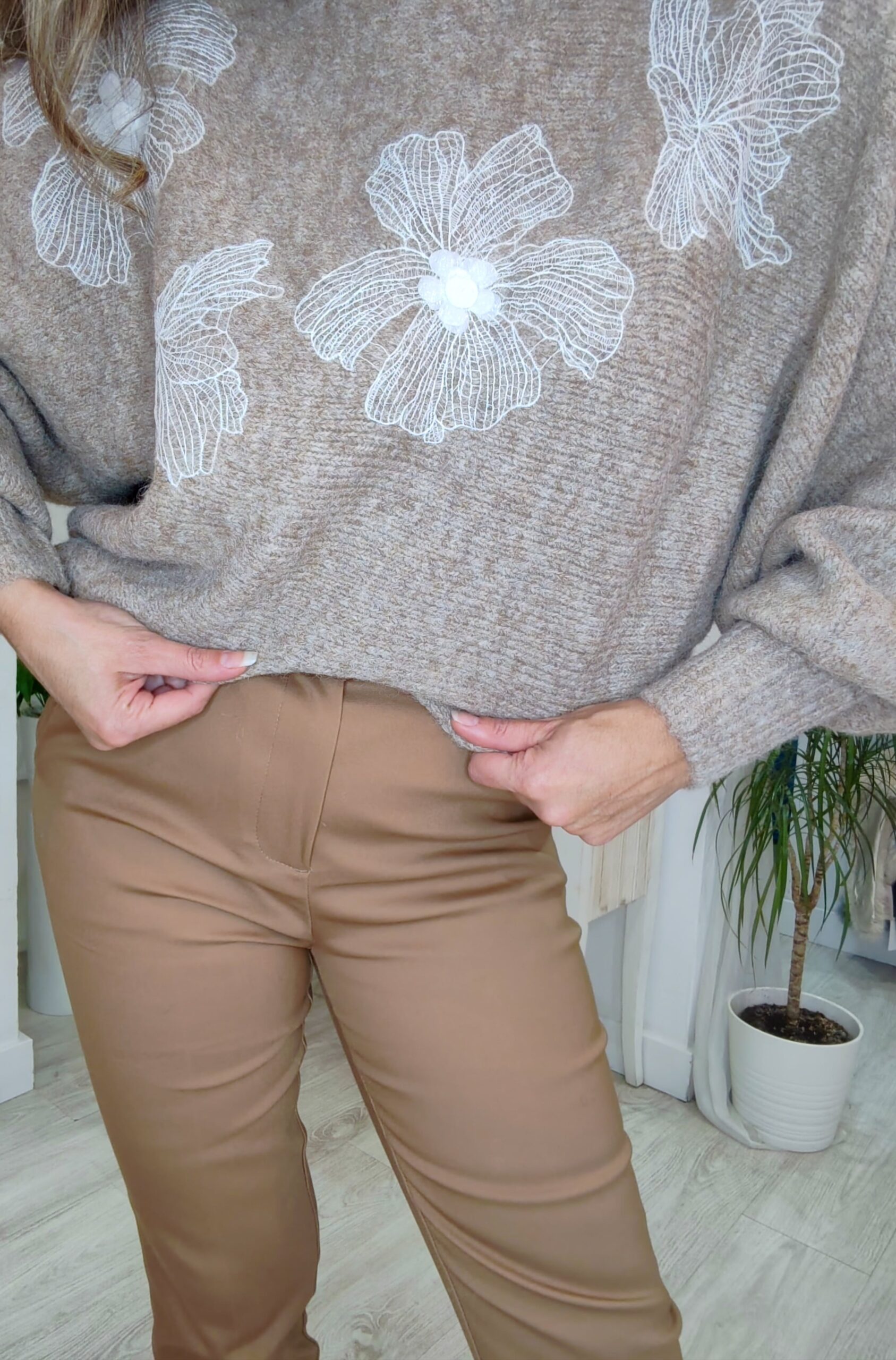 Jersey bonito, suave y cómodo, con unas flores bordadas en el pecho y pequeñas flores de organza.