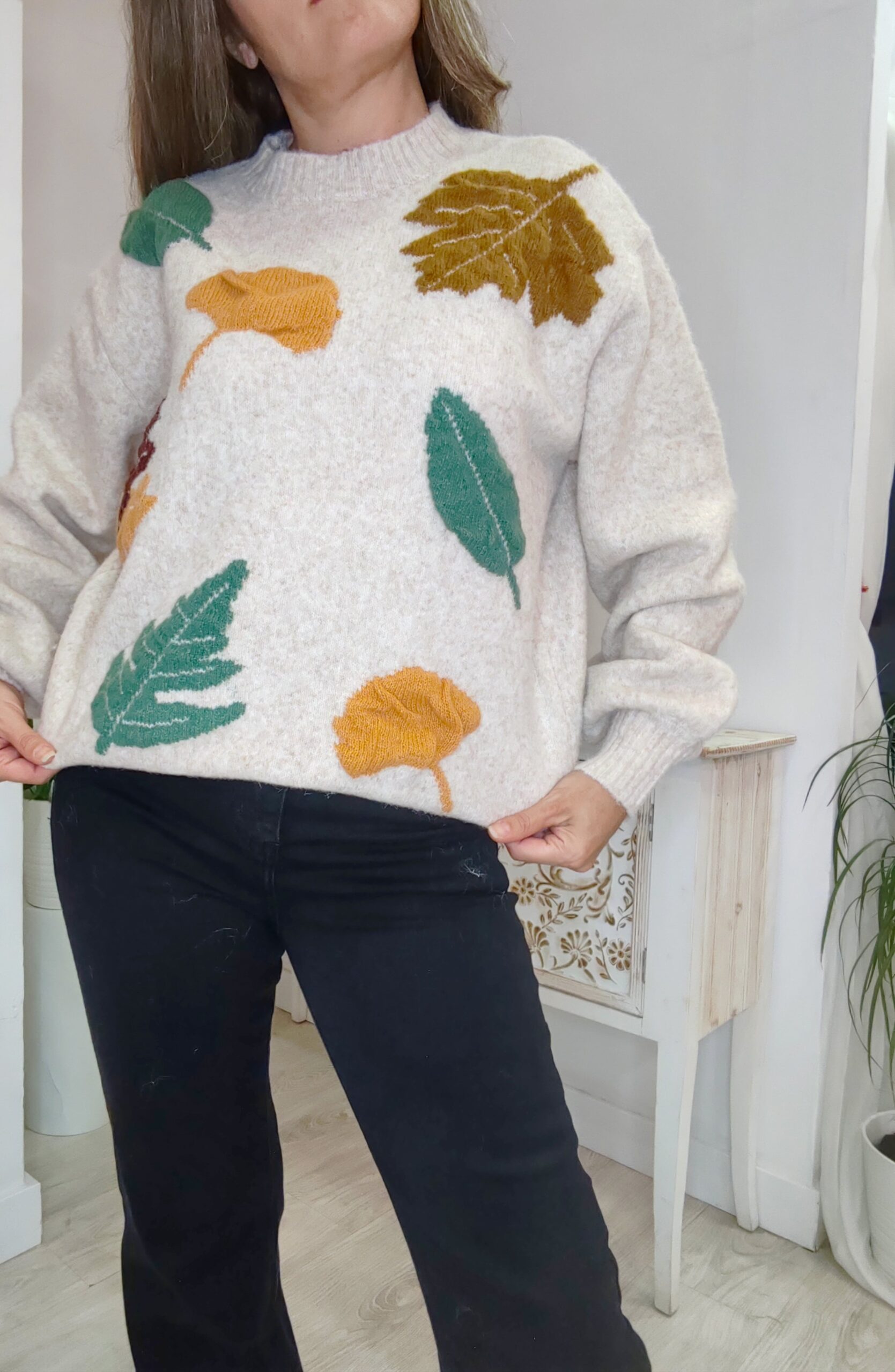 El jersey de punto con relieve otoñal lo convierte en una prenda con carácter propio.