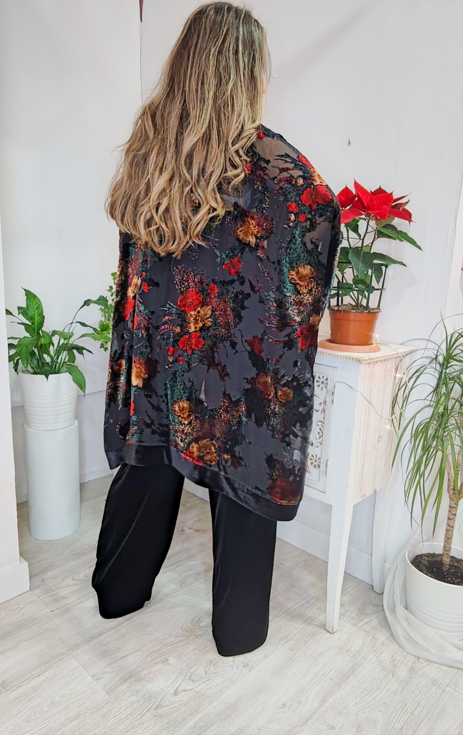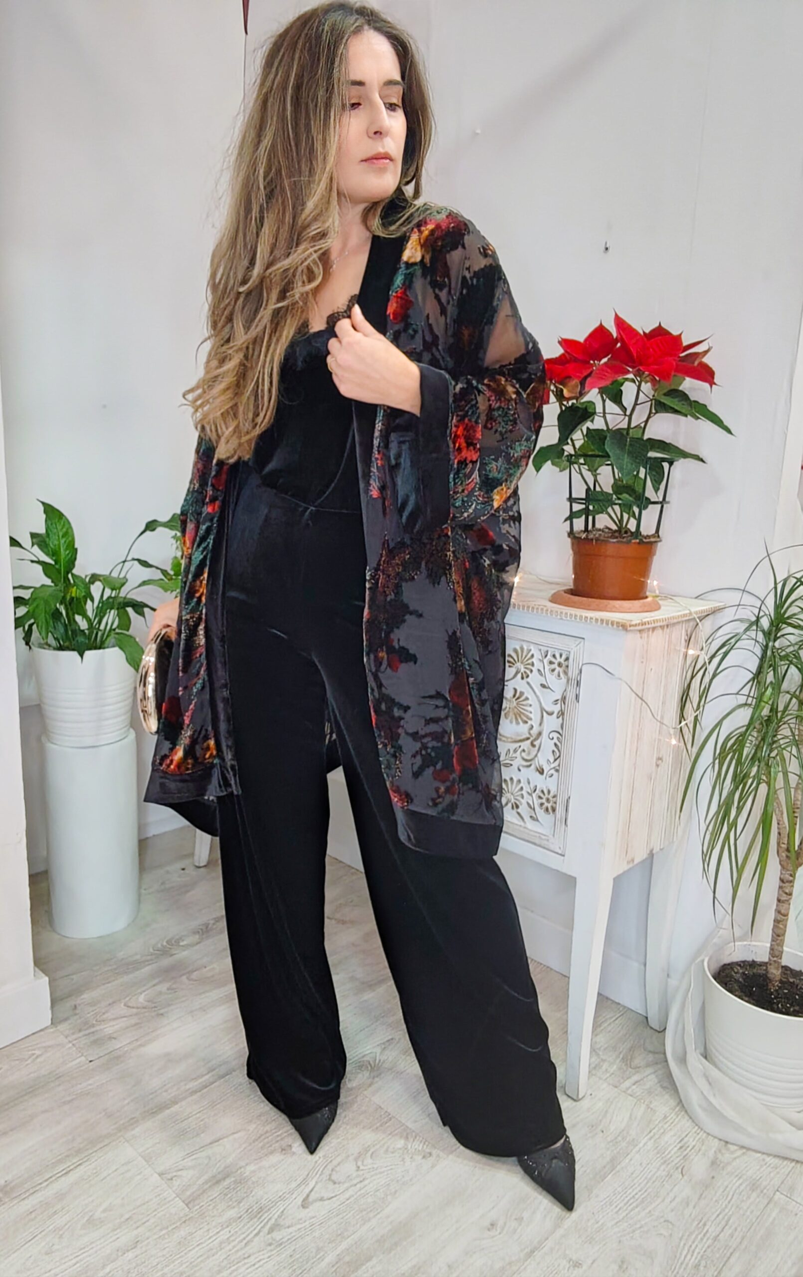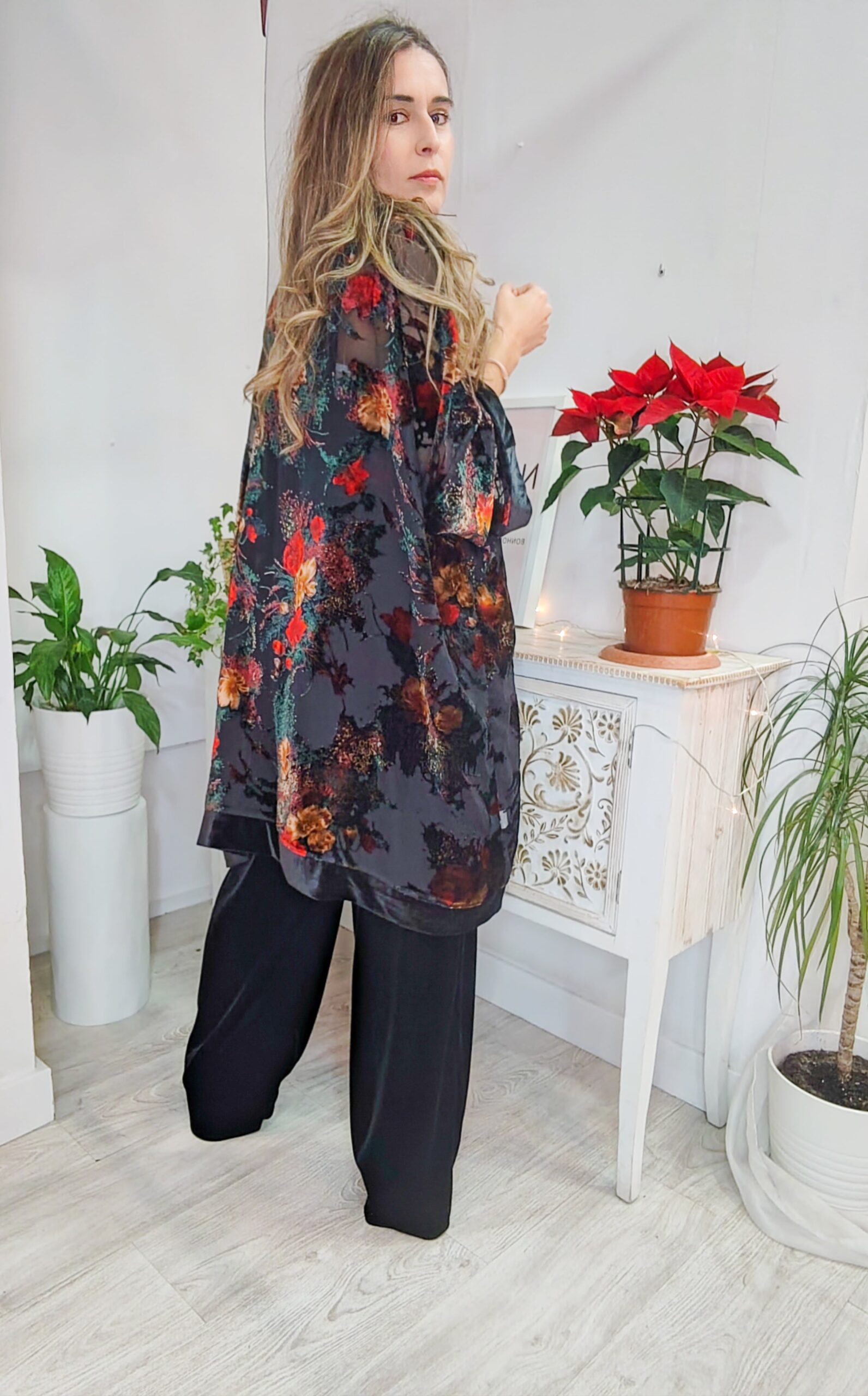 Kimono de terciopelo transparente con estampado, de talla única ideal para combinar con el pantalon Samira o con un buen conjunto de punto, para darle un look mas sofisticado.