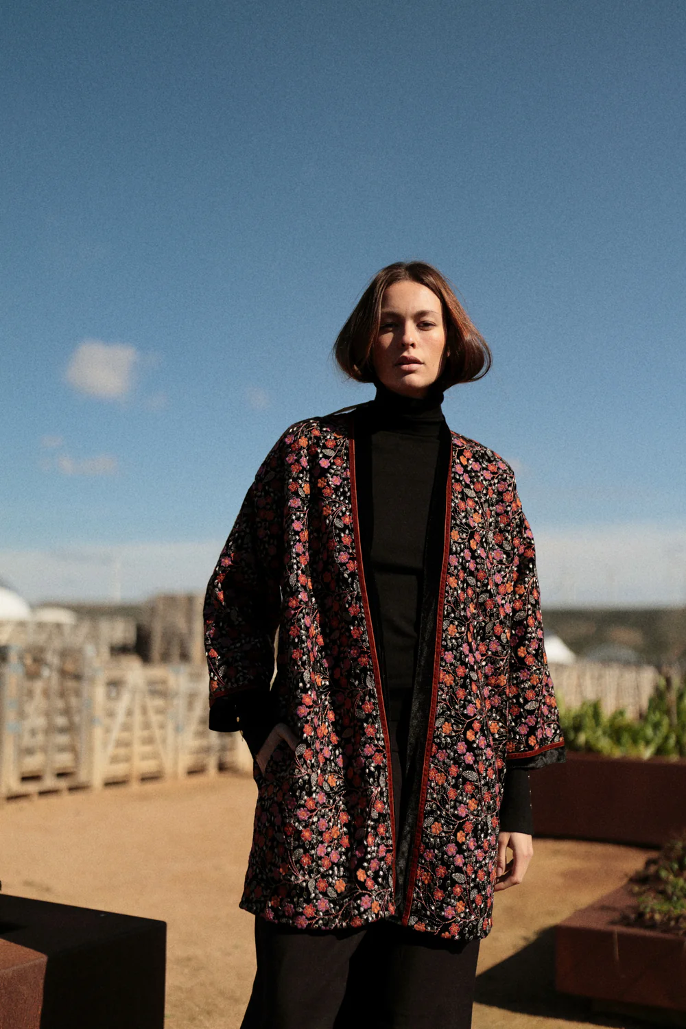 Kimono de terciopelo con bordado en burdeos y dorado, lleva bolsillos forrado en negro, fabricación nacional.