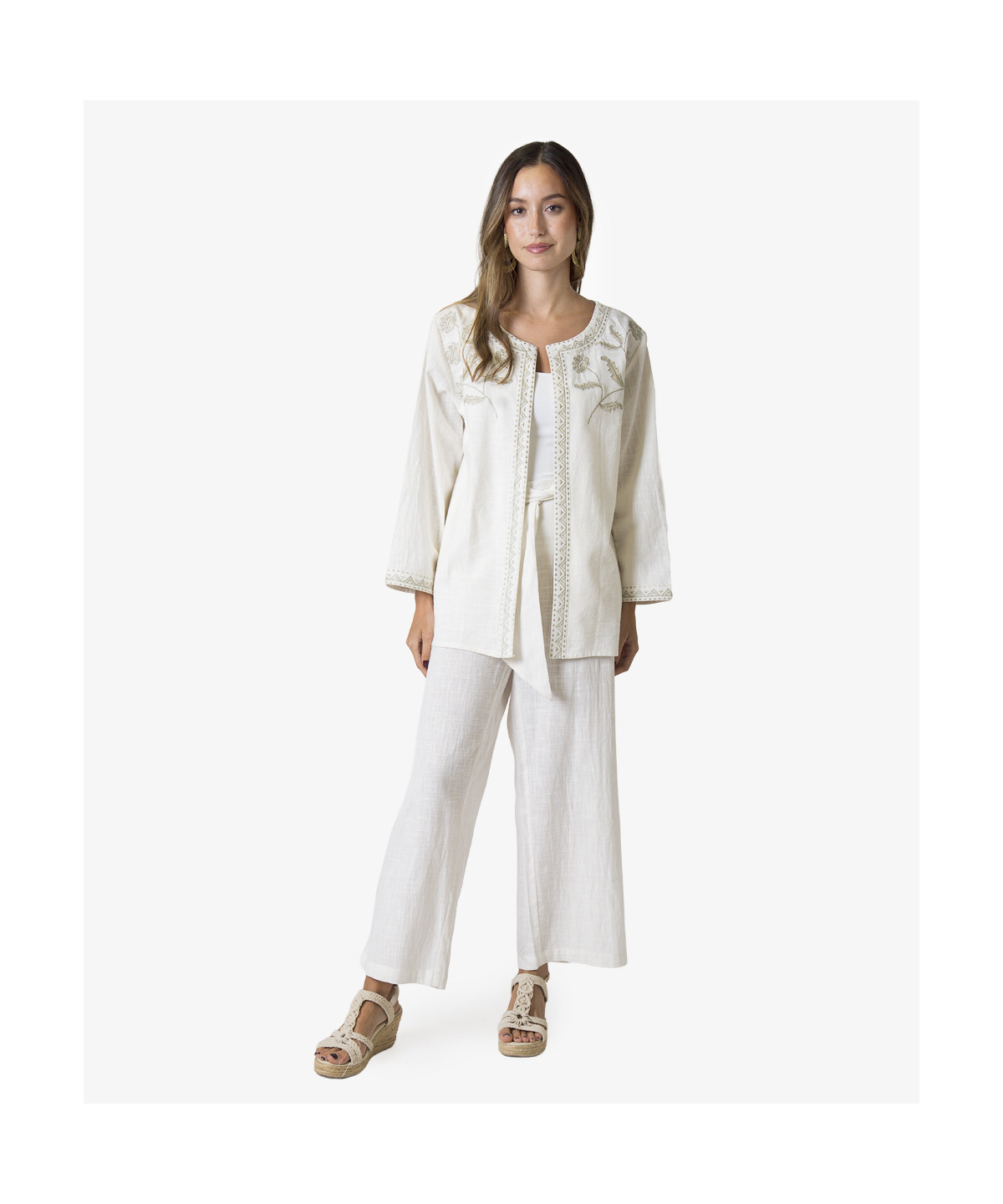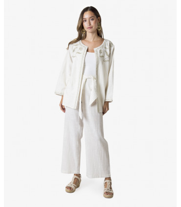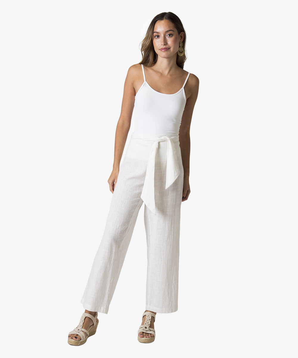 Pantalón en tejido de algodón natural » cotton slub» con textura, con bolsillos laterales, cinturón de lazo, y cintura trasera elástica