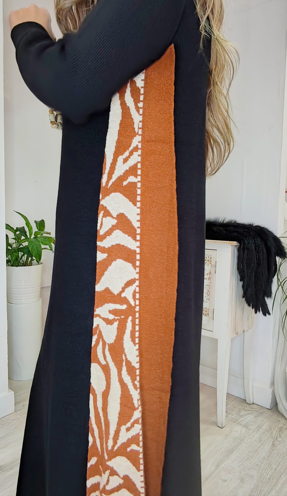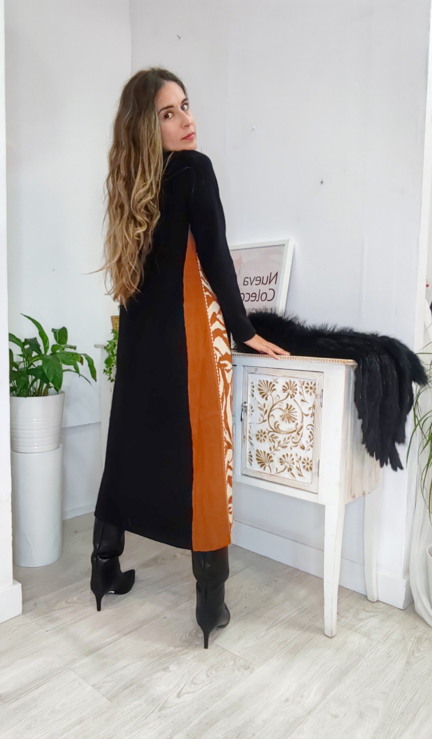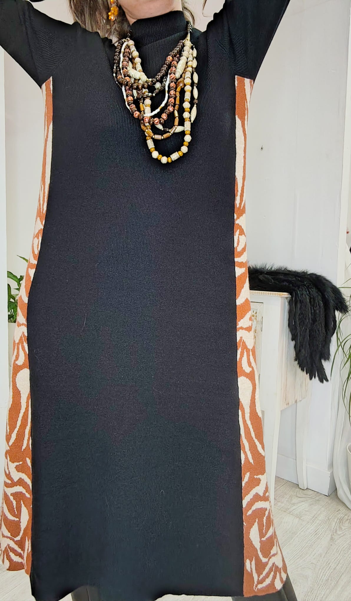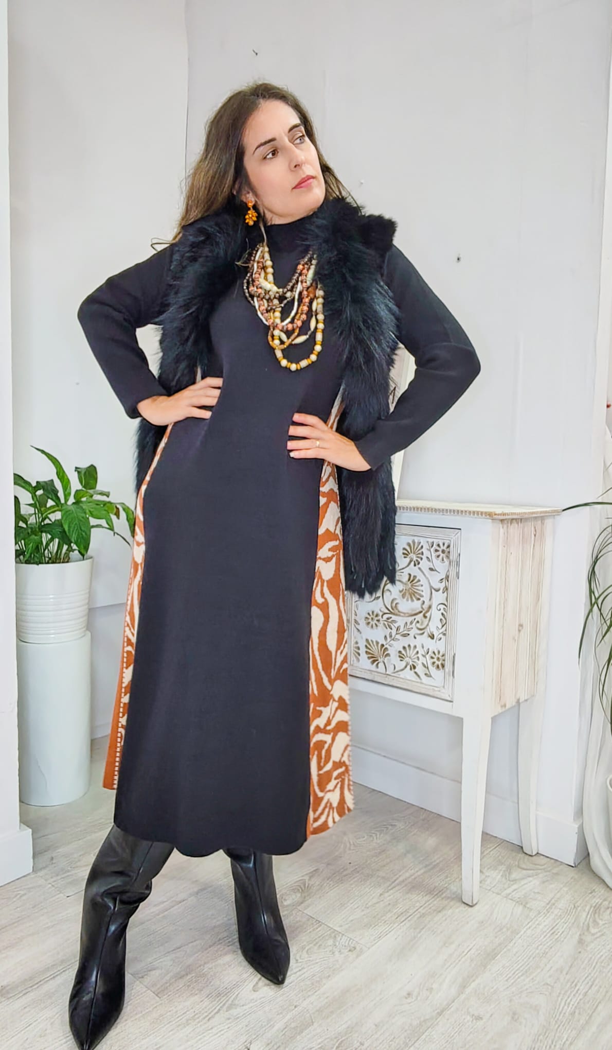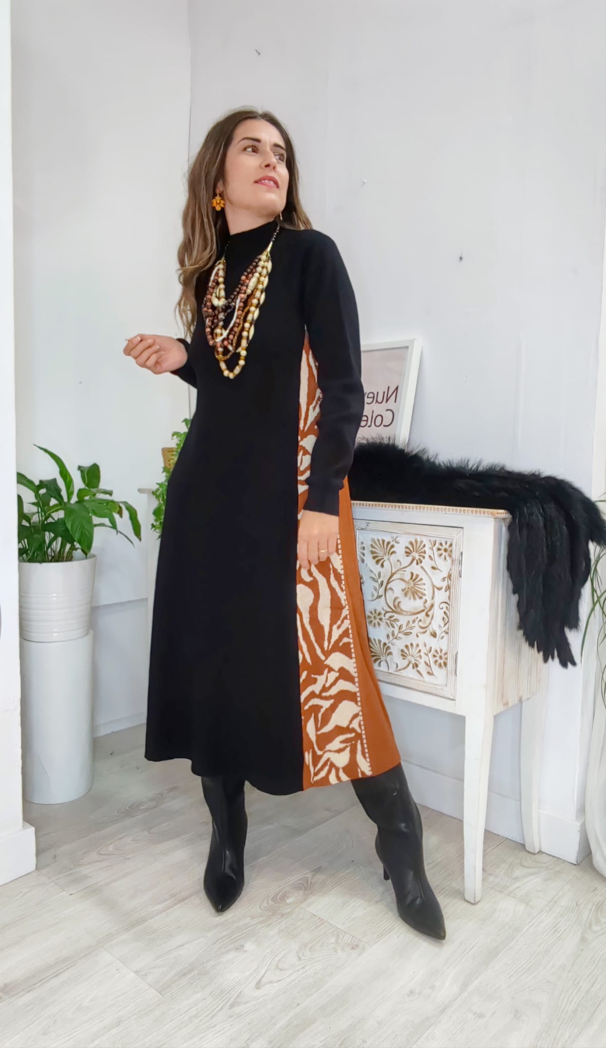 Vestido ancho de suave punto en línea A. con cortes laterales bicolor en estampado animal y color liso y cuello chimenea. en un color: negro. marrón y beige.. una pieza.