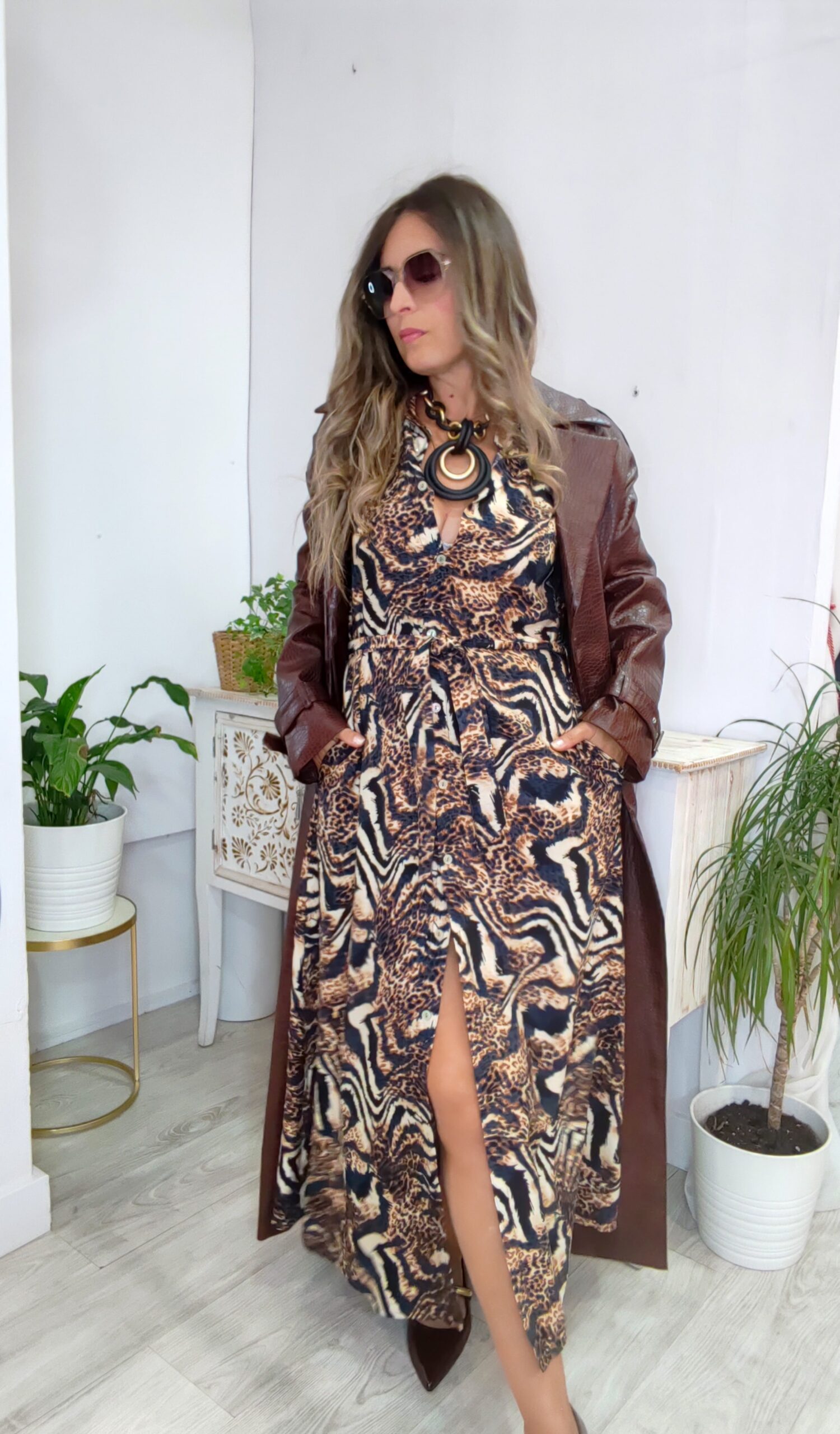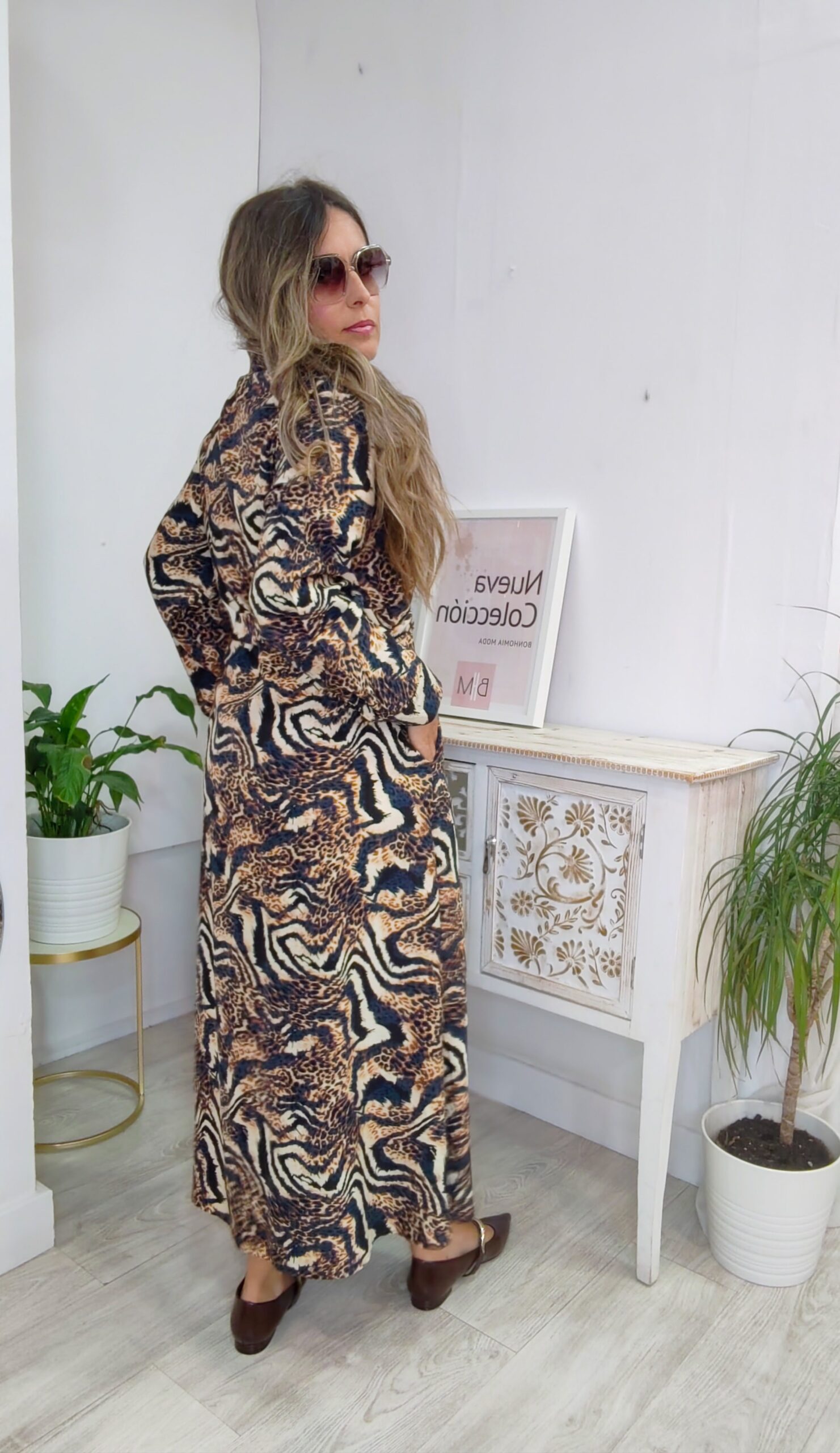 Vestido midi, camisero con estampado en animal print, vestido con bolsillos.