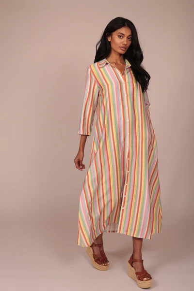 Irradia energía positiva con nuestro vestido camisero largo de rayas multicolor, la prenda estrella para un verano vibrante y lleno de estilo. Su diseño de líneas verticales en tonos pastel y cítricos no solo estiliza la figura, sino que aporta una frescura visual incomparable a tus días de sol. Confeccionado con un tejido liviano de caída impecable, este vestido cuenta con una botonadura frontal completa y mangas tres cuartos que permiten jugar con el look según la ocasión. La silueta fluida se complementa con discretos bolsillos laterales, fusionando la comodidad absoluta con una estética contemporánea y chic. Ya sea para un evento especial o un almuerzo relajado, su corte oversize refinado garantiza libertad de movimiento y un aire sofisticado sin esfuerzo. Combínalo con sandalias de cuña para elevar el conjunto y convertirte en el centro de todas las miradas esta temporada.
