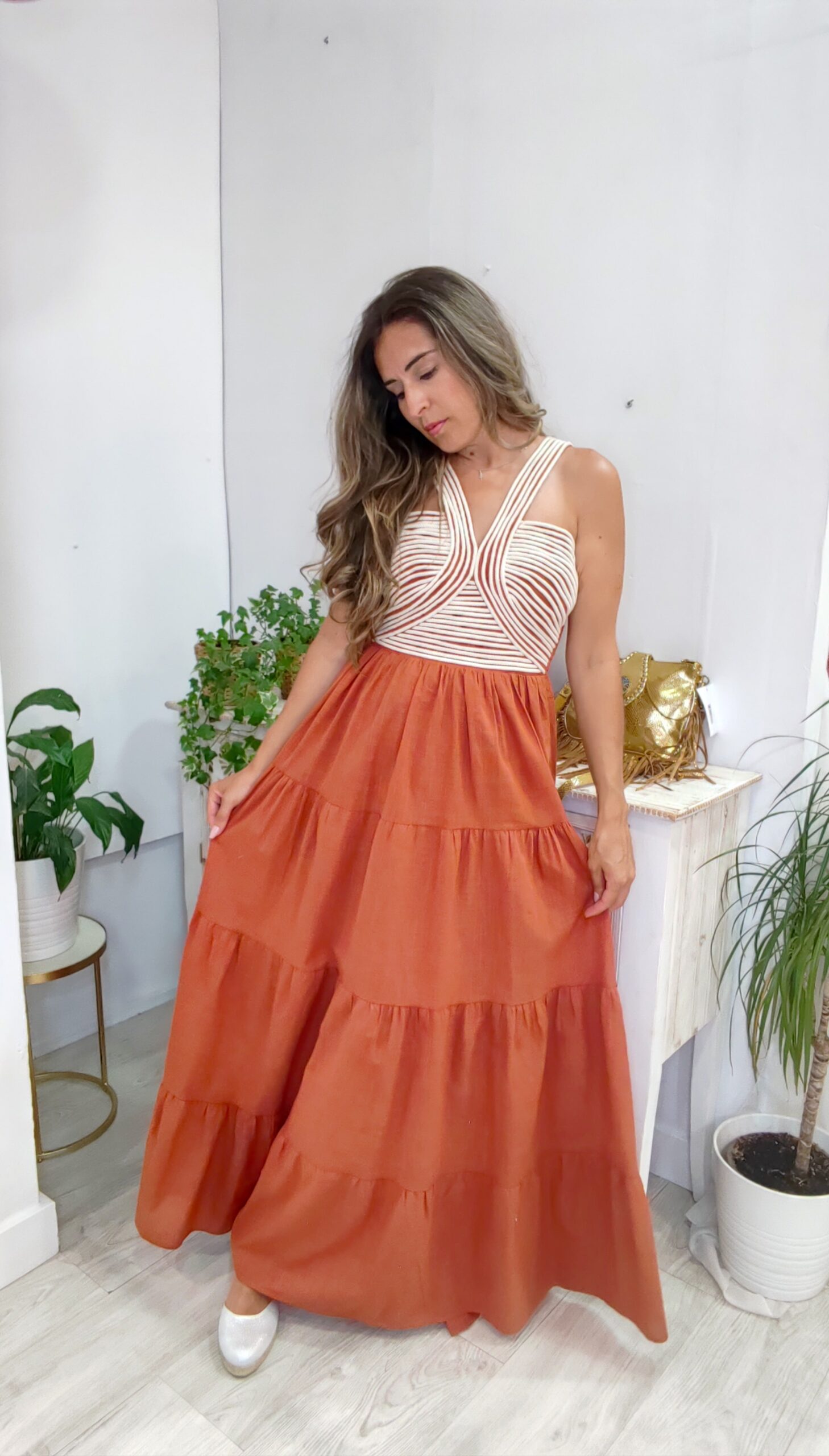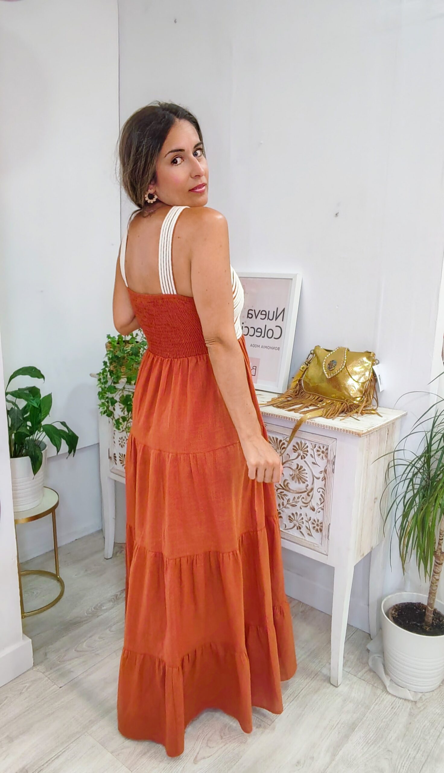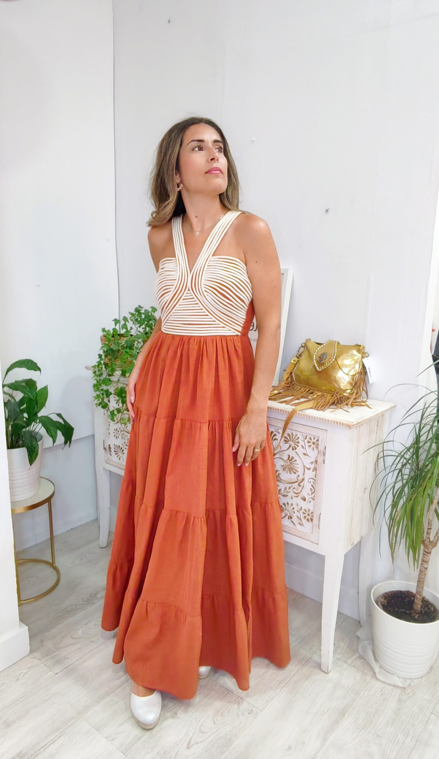 Vestido largo de algodón caldera con escote halter decorado con cuerdas, falda amplia con volantes para fluidez y sin cremallera. Disponible en tallas S/M y M/L