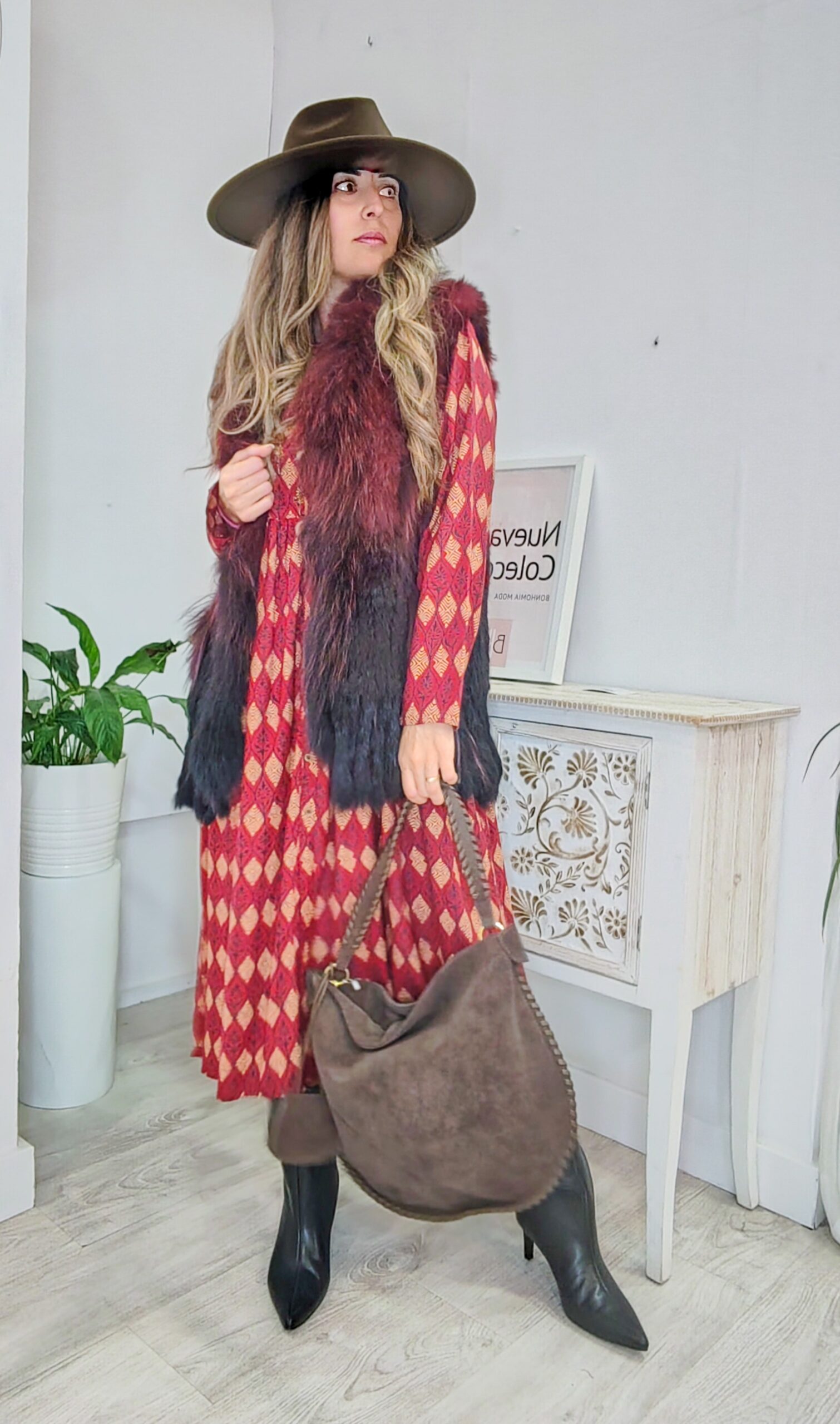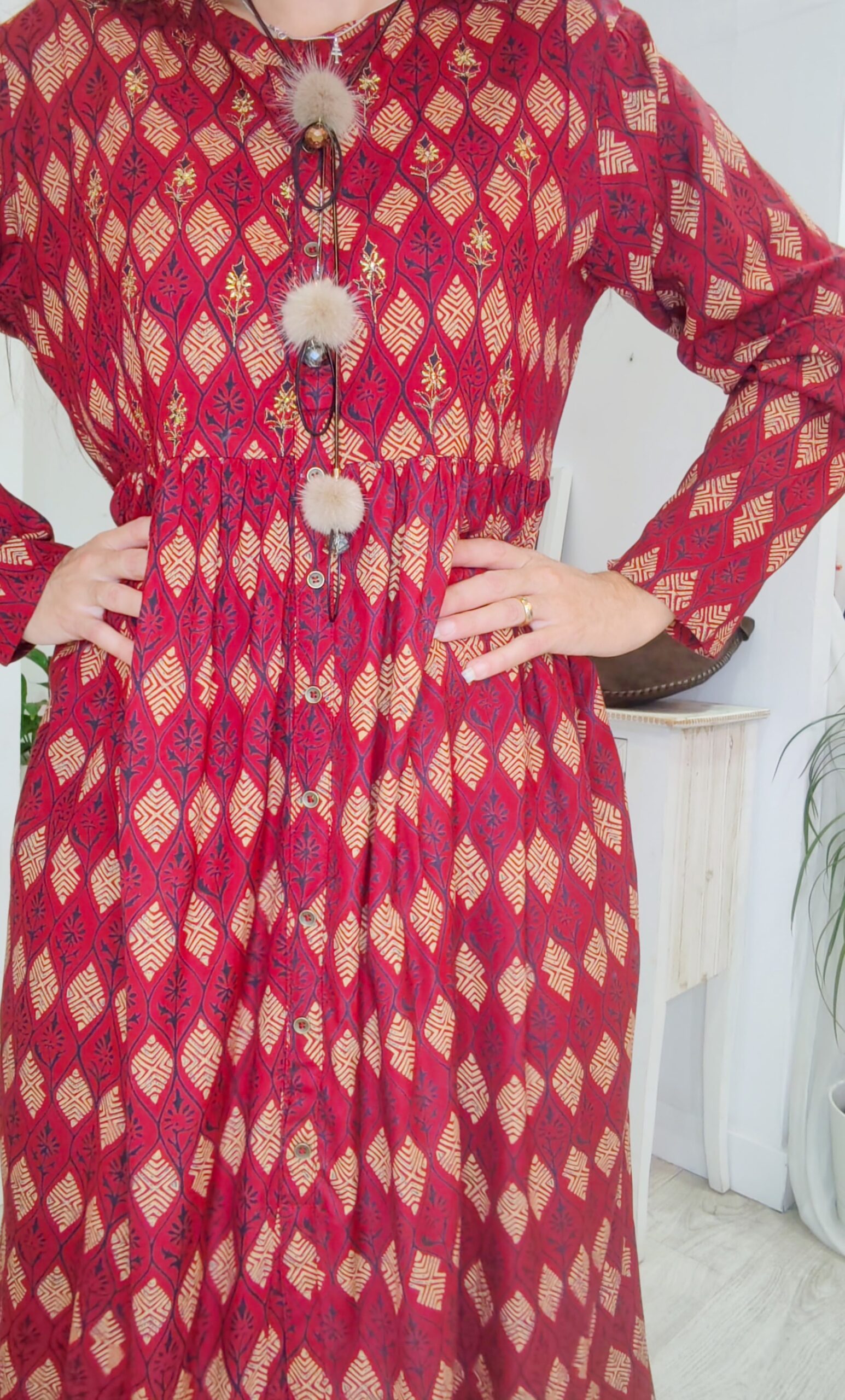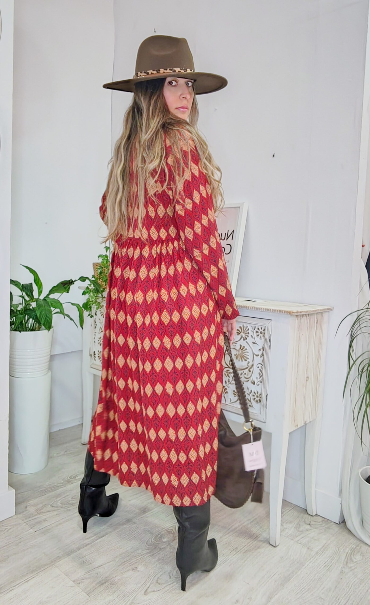 En estampado “Ethnic In Red”, en un color: gama de rojo, negro y ocres